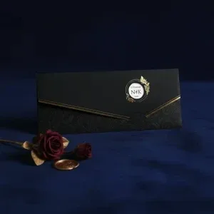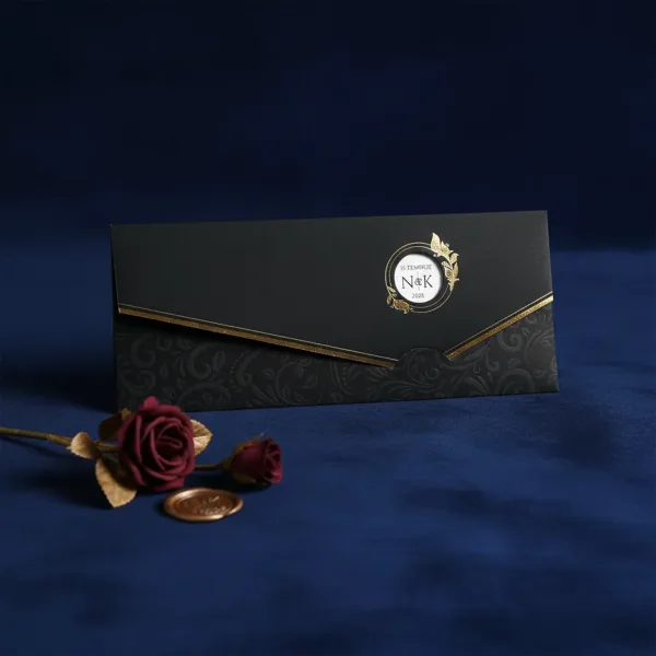 Söz, nikah, nişan ve düğün planlayan çiftler için özel olarak üretilmiş Altın Çerçeveli Lüks Siyah Davetiye 55 815 koduna sahiptir. Siyah zemin ve altın çerçeveli detaylar ile sade ve şık tasarıma sahip davetiyede 21,5 cm x 9,1 cm 190gr 1. Hamur kağıt kullanılmıştır. Ürün elinize açık şekilde ulaşacaktır. Kırım ve katlama izleri bellidir. Ürün elinize ulaştıktan sonra tarafınızdan yapılması gereken, kutuyu kırım ve katlama izlerinden katlayıp kelepçeleri yerine yerleştirmek olacaktır.