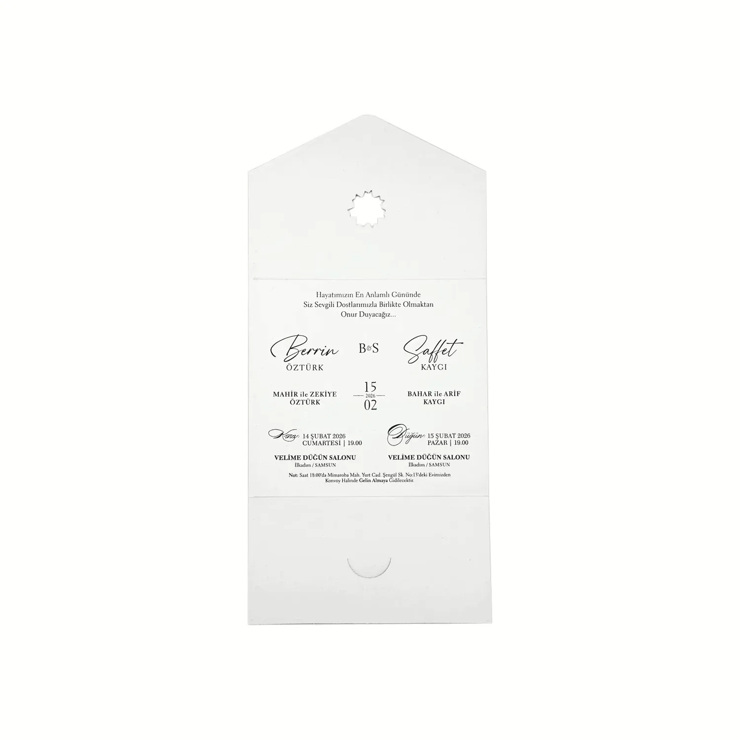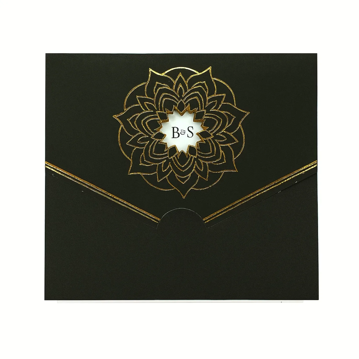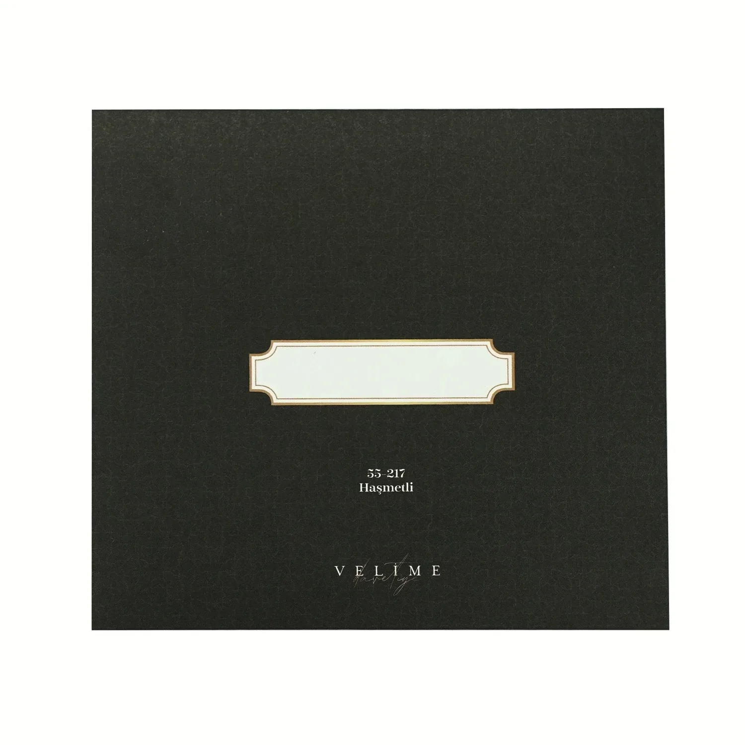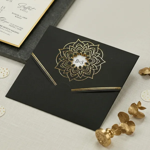 Söz, nikah, nişan ve düğün planlayan çiftler için özel olarak üretilmiş Altın Mandala Detaylı Siyah Davetiye 55 216 koduna sahiptir. Koyu gri zemin ve yaldızlı mandala detayları ile sade ve şık tasarıma sahip davetiyede 15,7 cm x 14,2 cm 190gr. 1. Hamur kağıt kullanılmıştır. Ürün elinize açık şekilde ulaşacaktır. Kırım ve katlama izleri bellidir. Ürün elinize ulaştıktan sonra tarafınızdan yapılması gereken, kutuyu kırım ve katlama izlerinden katlayıp kelepçeleri yerine yerleştirmek olacaktır.