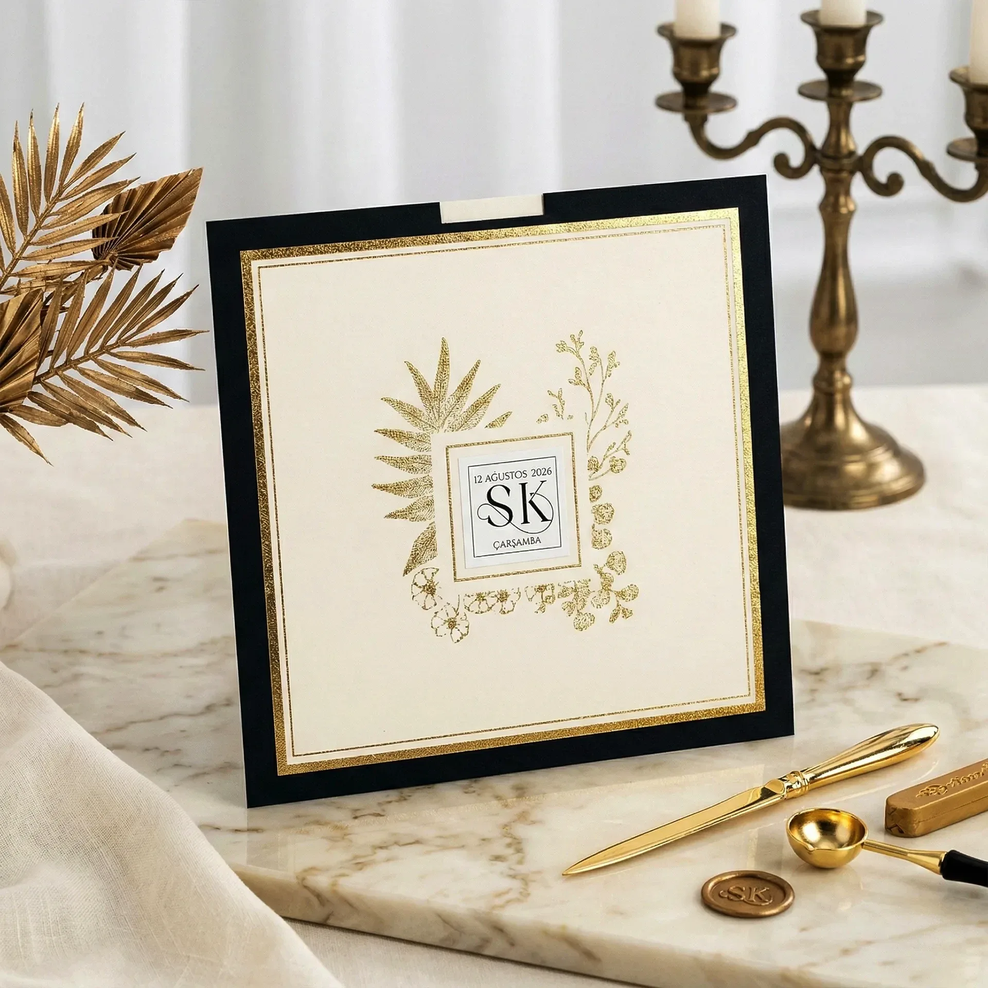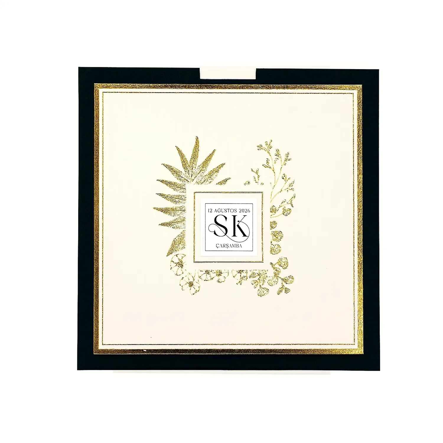 Söz, nikah, nişan ve düğün planlayan çiftler için özel olarak üretilmiş Altın Varaklı Minimal Davetiye 55 705 koduna sahiptir. Siyah çerçeveli beyaz zemin ve yaldızlı desenler ile sade ve şık tasarıma sahip davetiyede 15 cm x 15,2 cm 190gr. 1. Hamur kağıt kullanılmıştır. Ürün elinize açık şekilde ulaşacaktır. Kırım ve katlama izleri bellidir. Ürün elinize ulaştıktan sonra tarafınızdan yapılması gereken, kutuyu kırım ve katlama izlerinden katlayıp kelepçeleri yerine yerleştirmek olacaktır.
