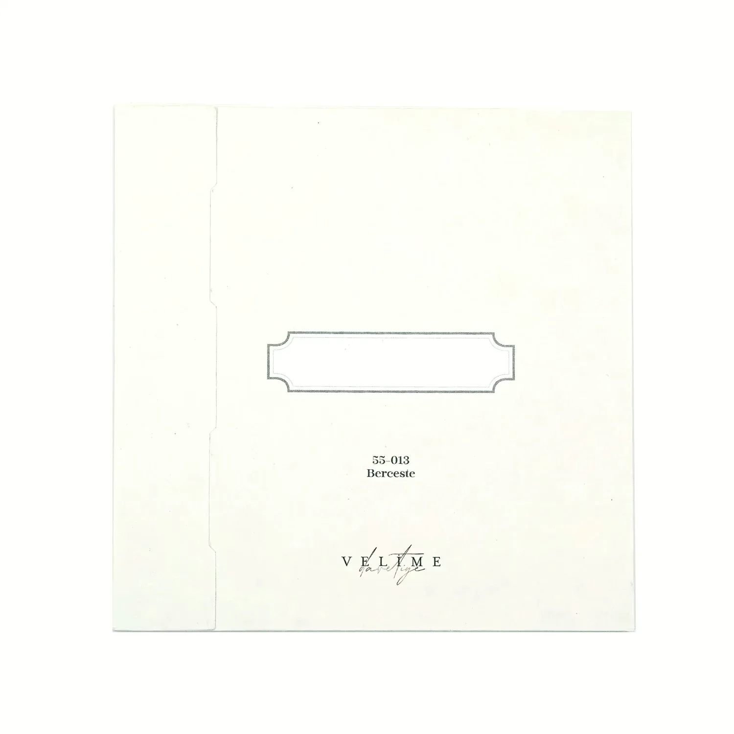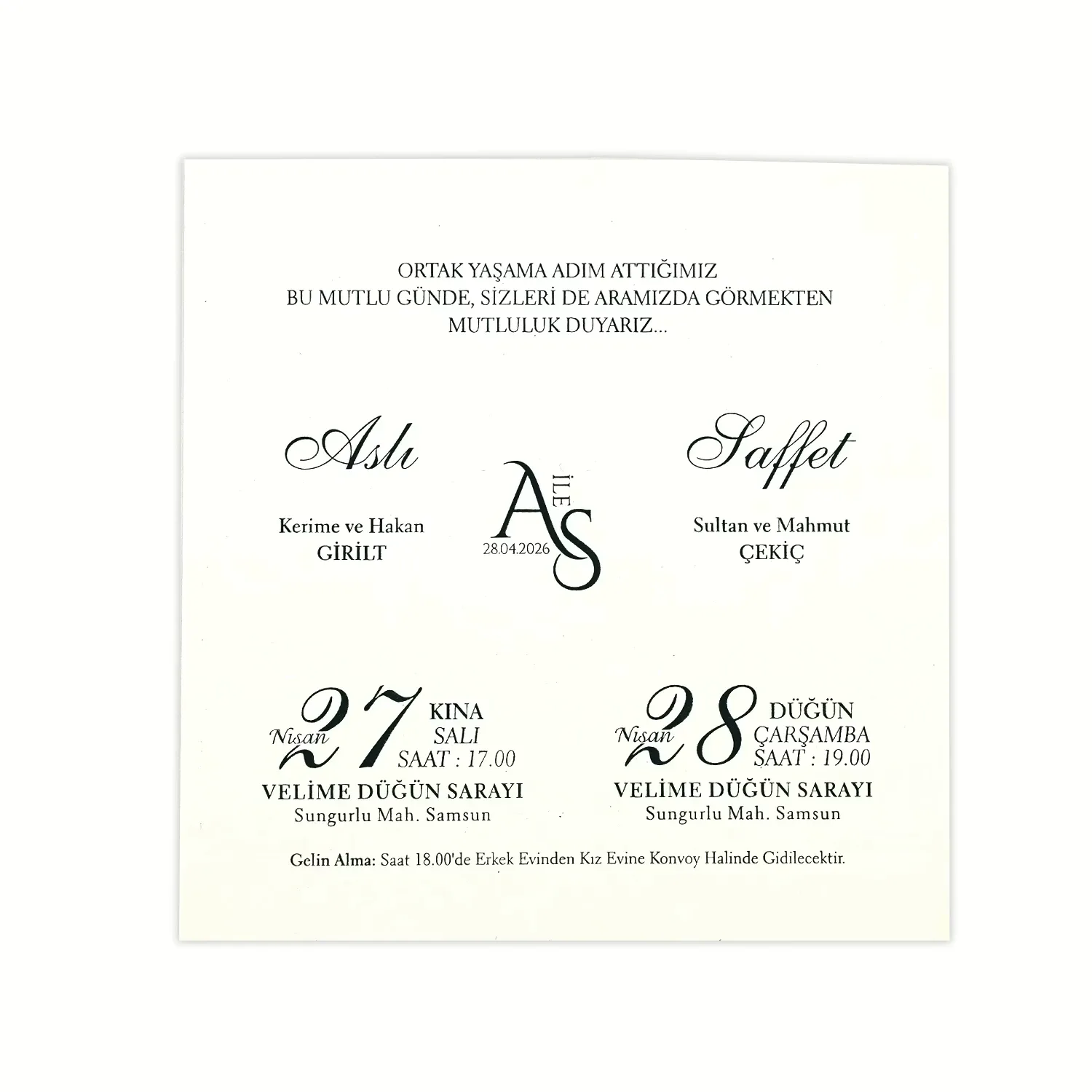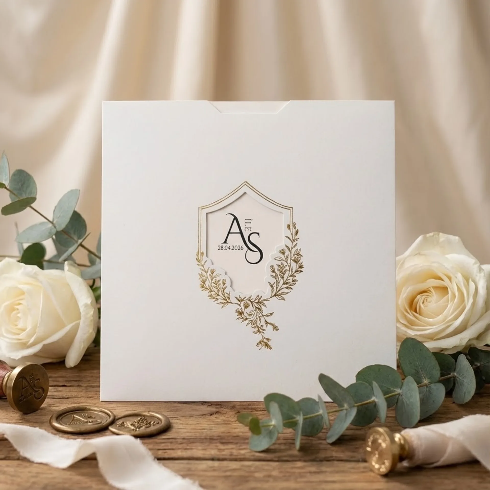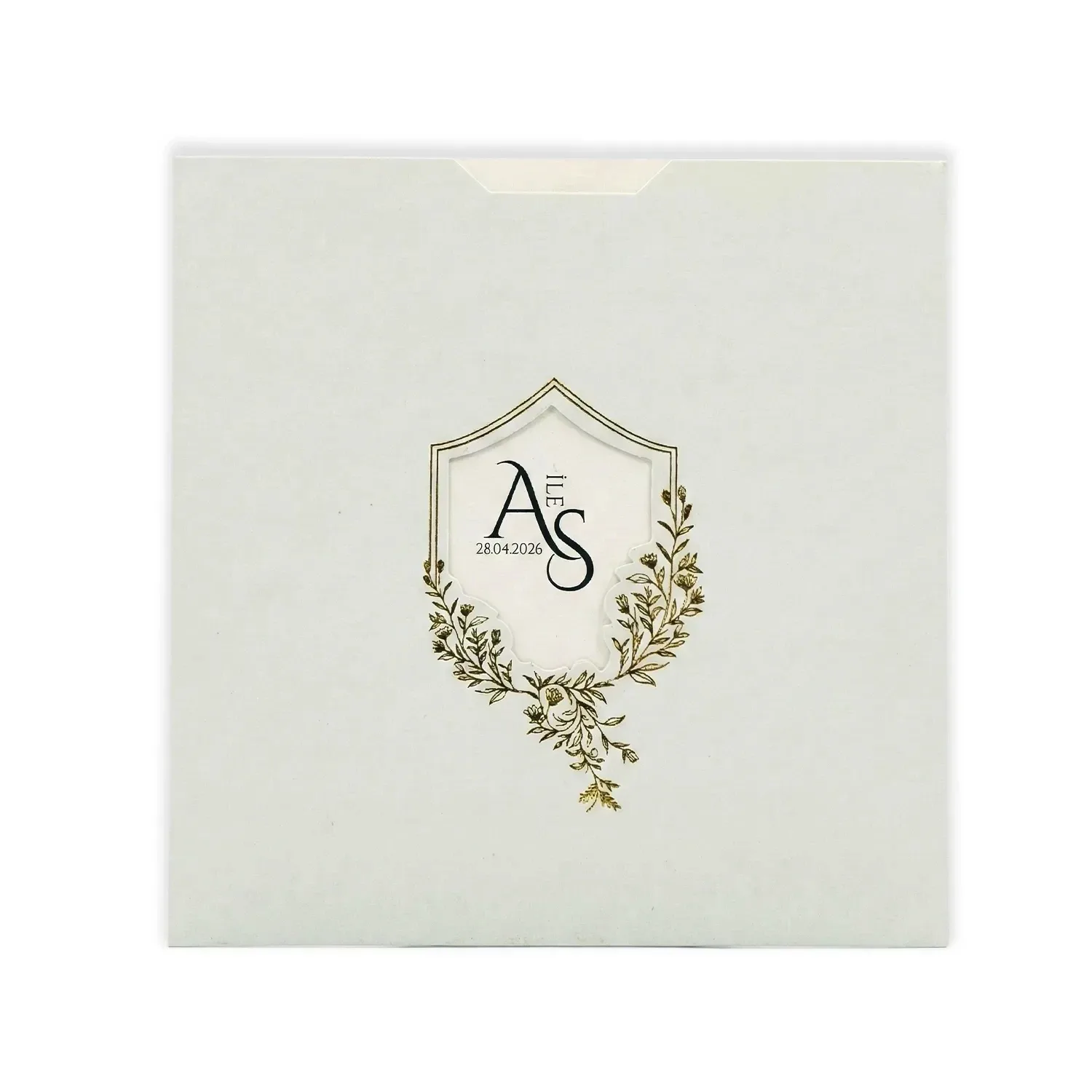 Söz, nikah, nişan ve düğün planlayan çiftler için özel olarak üretilmiş Altın Yaprak Süslemeli Davetiye 55 002 koduna sahiptir. Gri zemin ve altın yaprak detayları ile sade ve şık tasarıma sahip davetiyede 15 cm x 15,2 cm 190gr. 1. Hamur kağıt kullanılmıştır. Ürün elinize açık şekilde ulaşacaktır. Kırım ve katlama izleri bellidir. Ürün elinize ulaştıktan sonra tarafınızdan yapılması gereken, kutuyu kırım ve katlama izlerinden katlayıp kelepçeleri yerine yerleştirmek olacaktır.