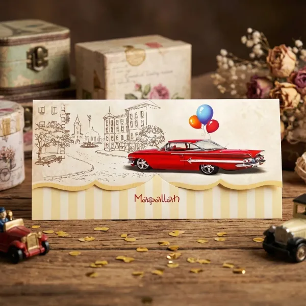 Sünnet olacak çocuklar için özel olarak üretilmiş Araba & Balon Desenli Sünnet Davetiyesi davetiye 55 104 koduna sahiptir. Krem renk tonlarında, sade ve şık tasarıma sahip davetiyede 21 cm x 10,5 cm 190gr. Amerikan Bristol kağıt kullanılmıştır. Ürün elinize açık şekilde ulaşacaktır. Kırım ve katlama izleri bellidir. Ürün elinize ulaştıktan sonra tarafınızdan yapılması gereken, kutuyu kırım ve katlama izlerinden katlayıp kelepçeleri yerine yerleştirmek olacaktır.