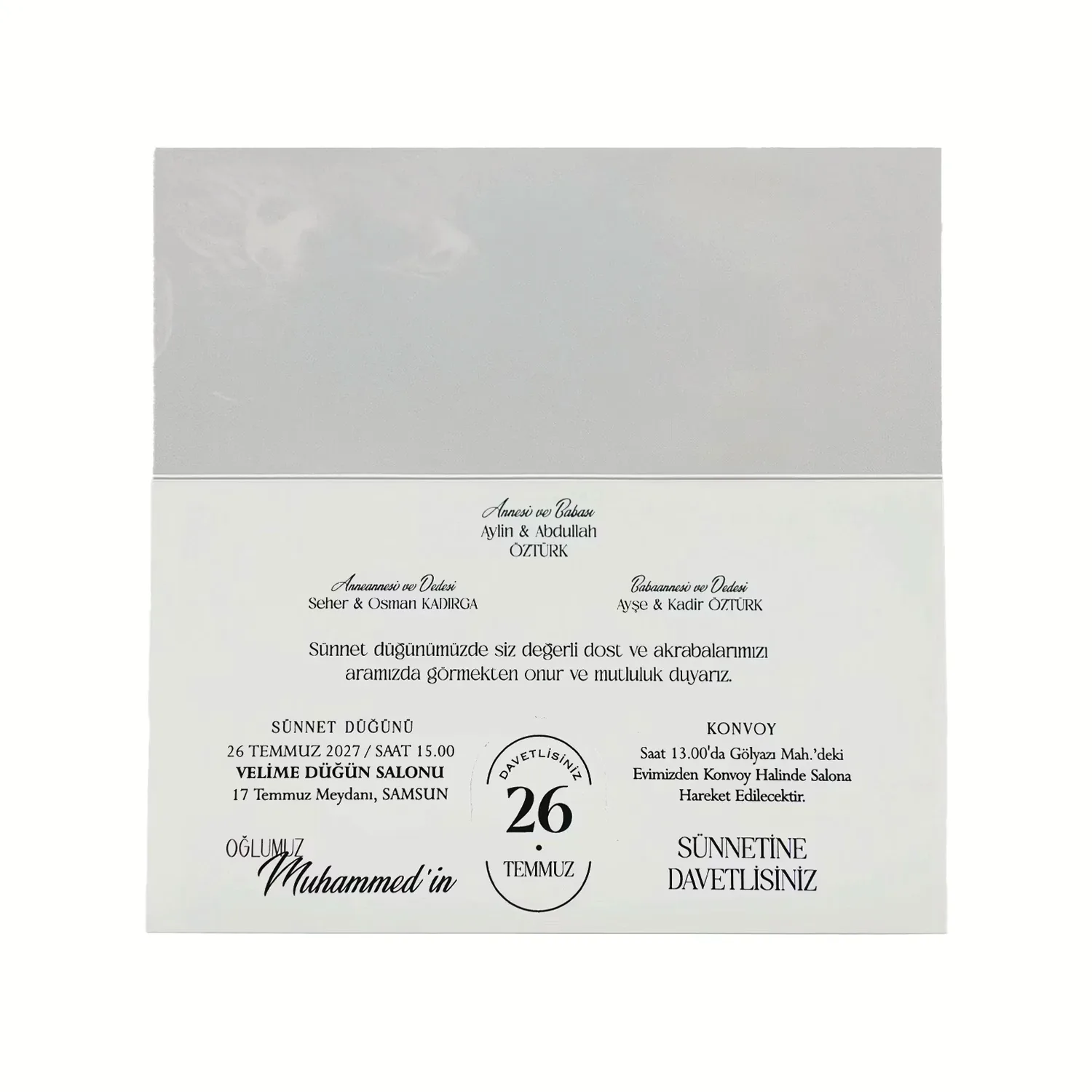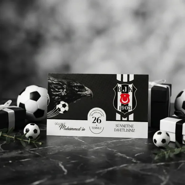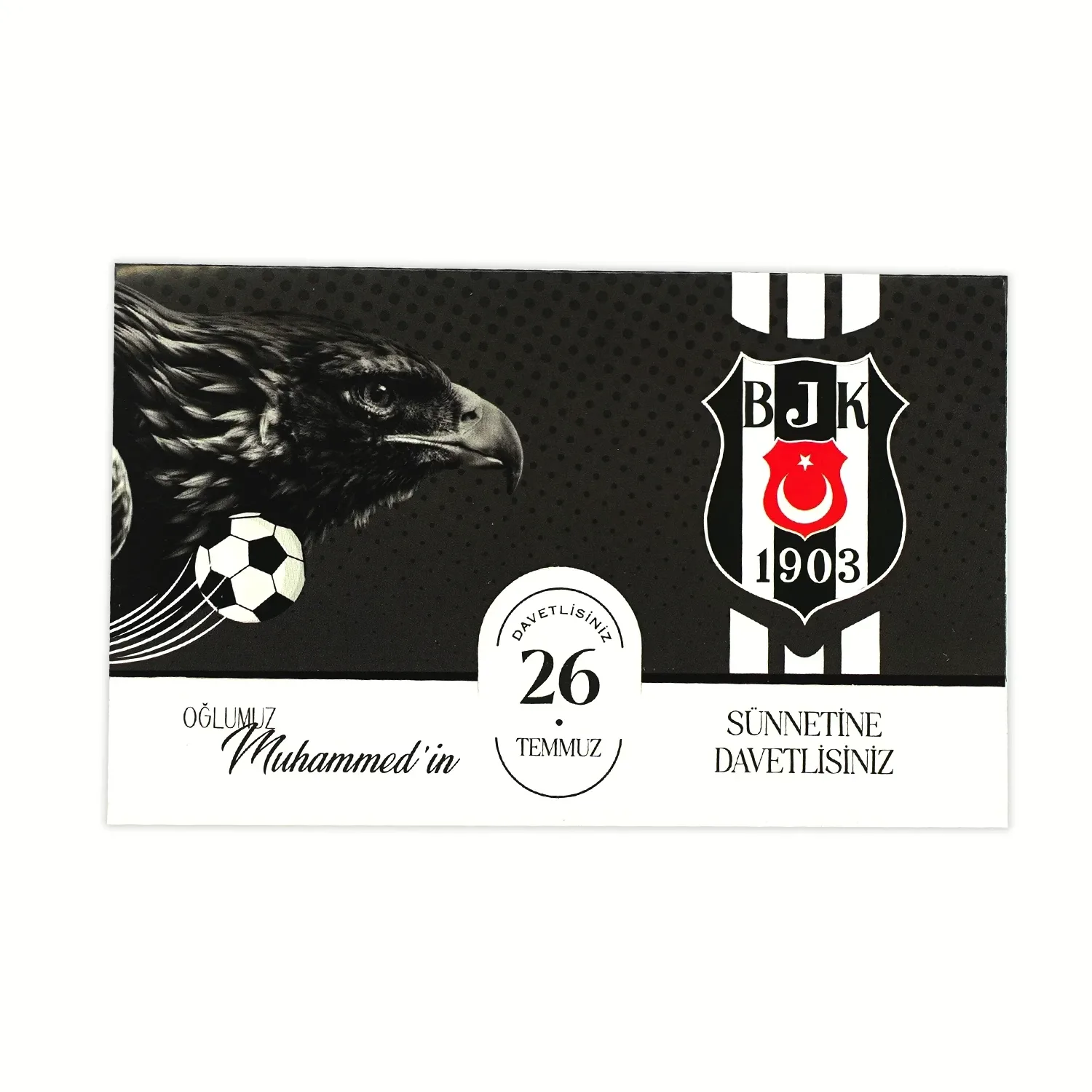 Beşiktaş fanatiği çocuklar için özel olarak üretilmiş Beşiktaş Kara Kartal Desenli Davetiye davetiye 55 906 koduna sahiptir. Siyah renk tonlarında, sade ve şık tasarıma sahip davetiyede 16,7 cm x 10,4 cm 190gr Amerikan Bristol kağıt kullanılmıştır. Ürün elinize açık şekilde ulaşacaktır. Kırım ve katlama izleri bellidir. Ürün elinize ulaştıktan sonra tarafınızdan yapılması gereken, kutuyu kırım ve katlama izlerinden katlayıp kelepçeleri yerine yerleştirmek olacaktır.