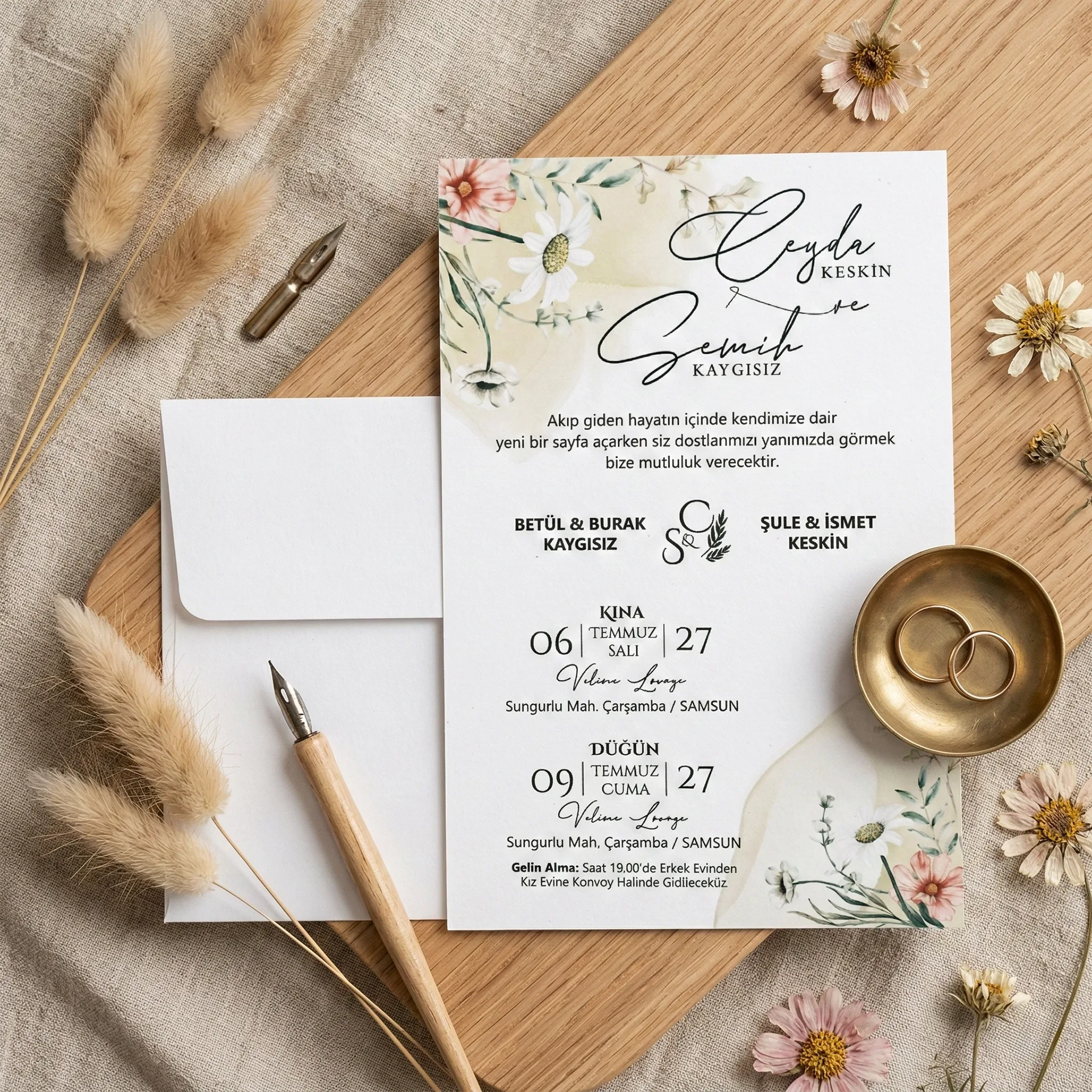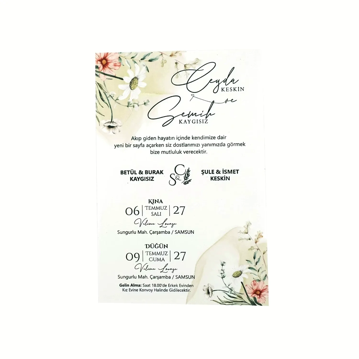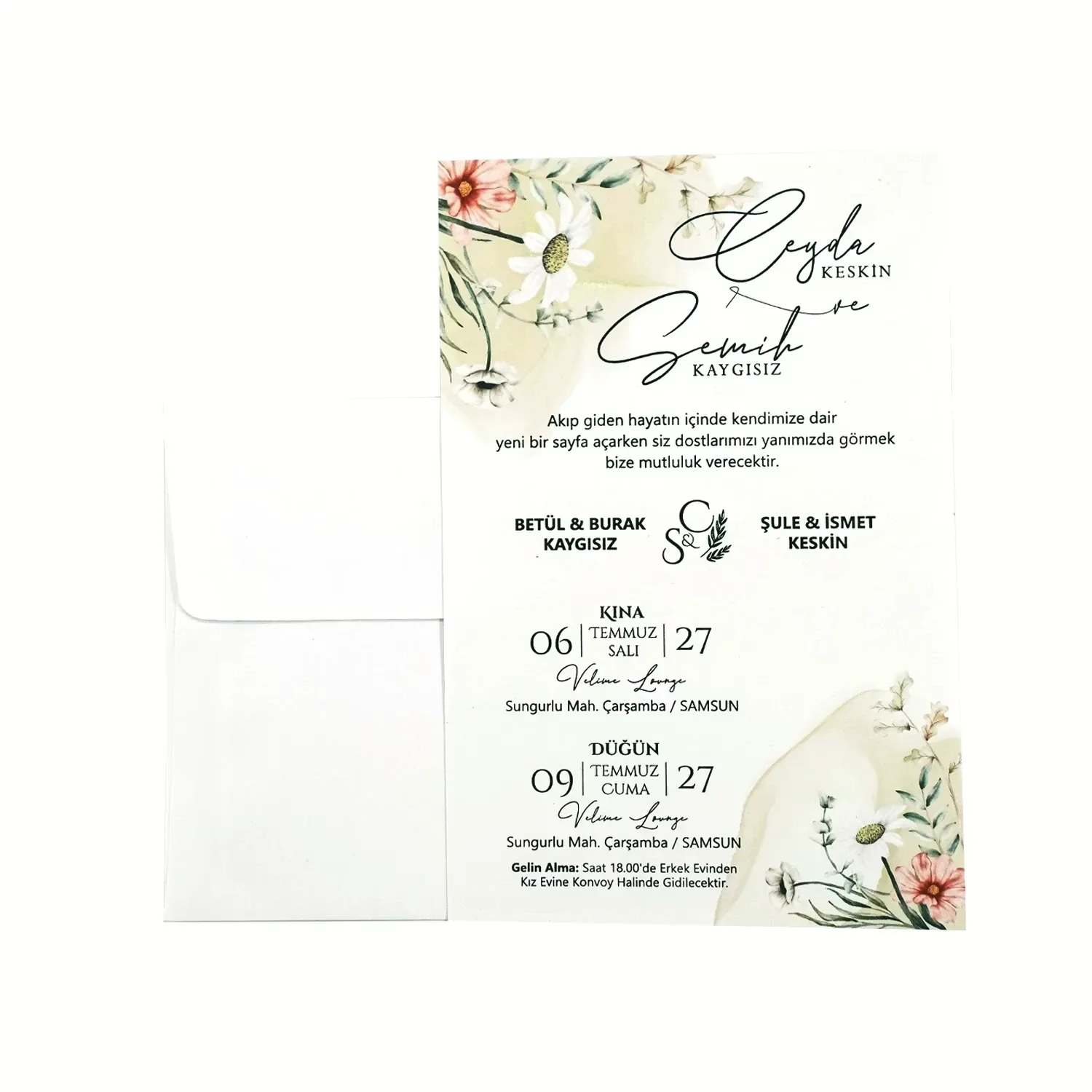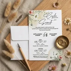 Söz, nikah, nişan ve düğün planlayan çiftler için özel olarak üretilmiş Çiçek Buketi Desenli Dik Davetiye 55 753 koduna sahiptir. Beyaz zemin ve çiçek buketi desenli detayları ile sade ve şık tasarıma sahip davetiyede 12 cm x 18 cm 190gr 1. Hamur kağıt kullanılmıştır. Ürün elinize açık şekilde ulaşacaktır. Kırım ve katlama izleri bellidir. Ürün elinize ulaştıktan sonra tarafınızdan yapılması gereken, kutuyu kırım ve katlama izlerinden katlayıp kelepçeleri yerine yerleştirmek olacaktır.