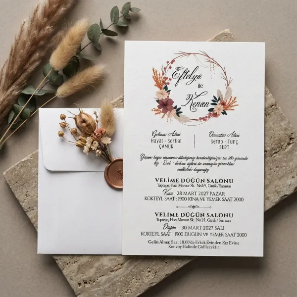 Söz, nikah, nişan ve düğün planlayan çiftler için özel olarak üretilmiş Çiçek Çemberli Ekonomik Düğün Davetiyesi 55 757 koduna sahiptir. Beyaz zemin üzerine çiçek desenleri ile sade ve şık tasarıma sahip davetiyede 22 cm x 18 cm 190gr. 1. Hamur kağıt kullanılmıştır. Ürün elinize açık şekilde ulaşacaktır. Kırım ve katlama izleri bellidir. Ürün elinize ulaştıktan sonra tarafınızdan yapılması gereken, kutuyu kırım ve katlama izlerinden katlayıp kelepçeleri yerine yerleştirmek olacaktır.