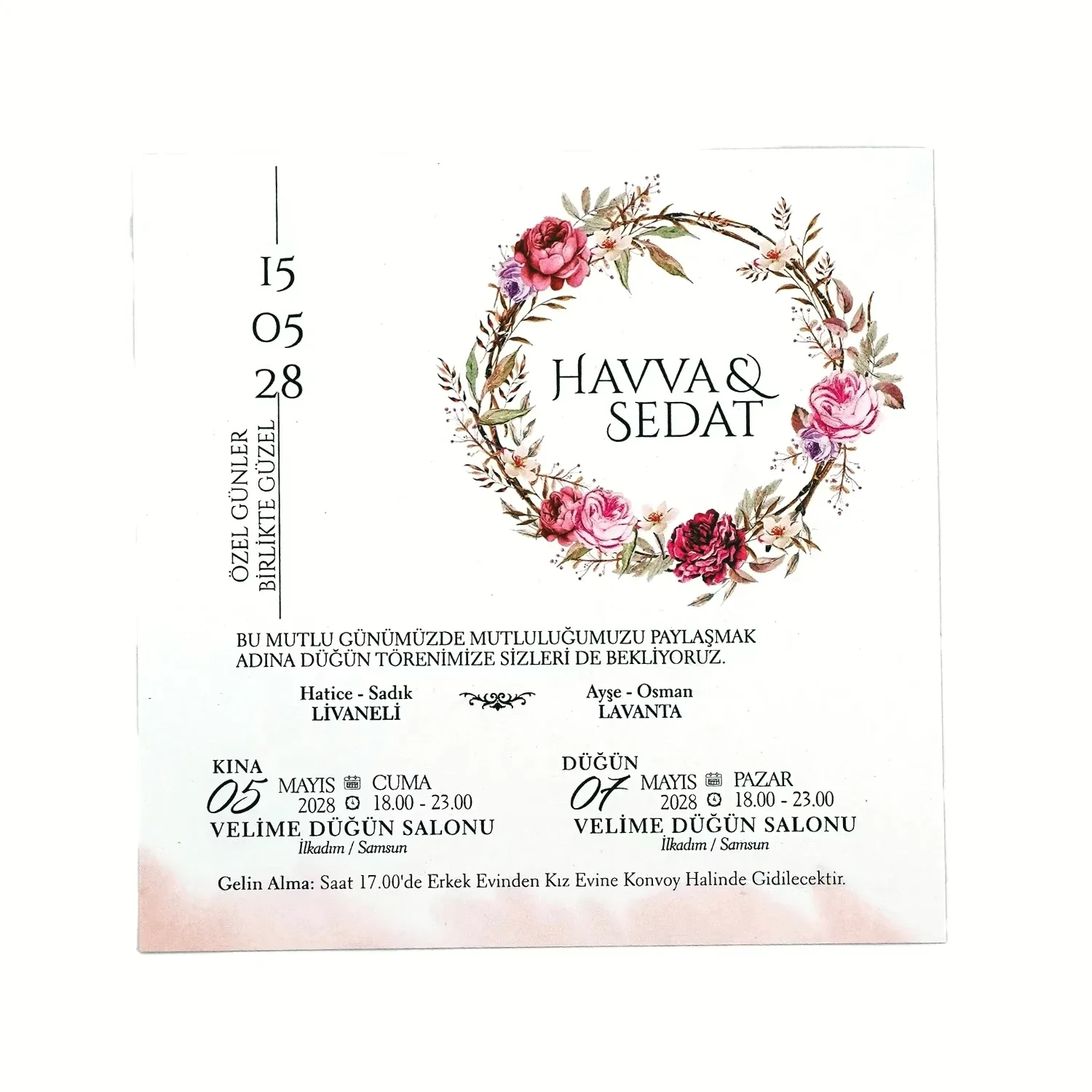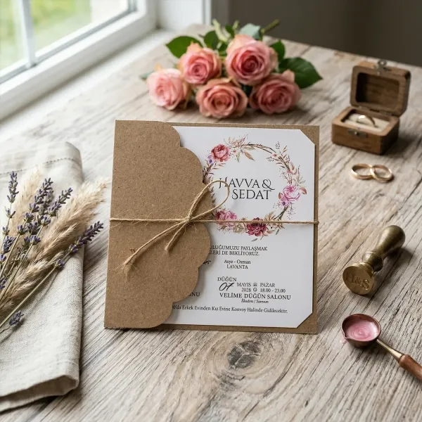 Söz, nikah, nişan ve düğün planlayan çiftler için özel olarak üretilmiş Çiçek Desenli İpli Kare Kraft Davetiye 55 402 koduna sahiptir. Beyaz zemin ve çiçek detayları ile ipli ve kraft kağıt tasarımına sahip davetiyede 14,9 cm x 14,9 cm 190gr Kraft kağıt kullanılmıştır. Ürün elinize açık şekilde ulaşacaktır. Kırım ve katlama izleri bellidir. Ürün elinize ulaştıktan sonra tarafınızdan yapılması gereken, kutuyu kırım ve katlama izlerinden katlayıp kelepçeleri yerine yerleştirmek olacaktır.