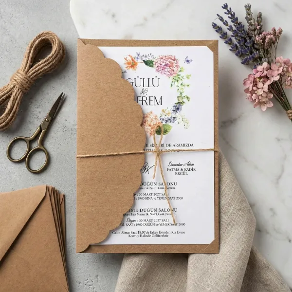 Söz, nikah, nişan ve düğün planlayan çiftler için özel olarak üretilmiş Çiçek Desenli İpli Kraft Davetiye 55 401 koduna sahiptir. Beyaz zemin ve çiçek detayları ile ipli ve kraft kağıt tasarımına sahip davetiyede 14,3 cm x 22 cm 190gr Kraft kağıt kullanılmıştır. Ürün elinize açık şekilde ulaşacaktır. Kırım ve katlama izleri bellidir. Ürün elinize ulaştıktan sonra tarafınızdan yapılması gereken, kutuyu kırım ve katlama izlerinden katlayıp kelepçeleri yerine yerleştirmek olacaktır.