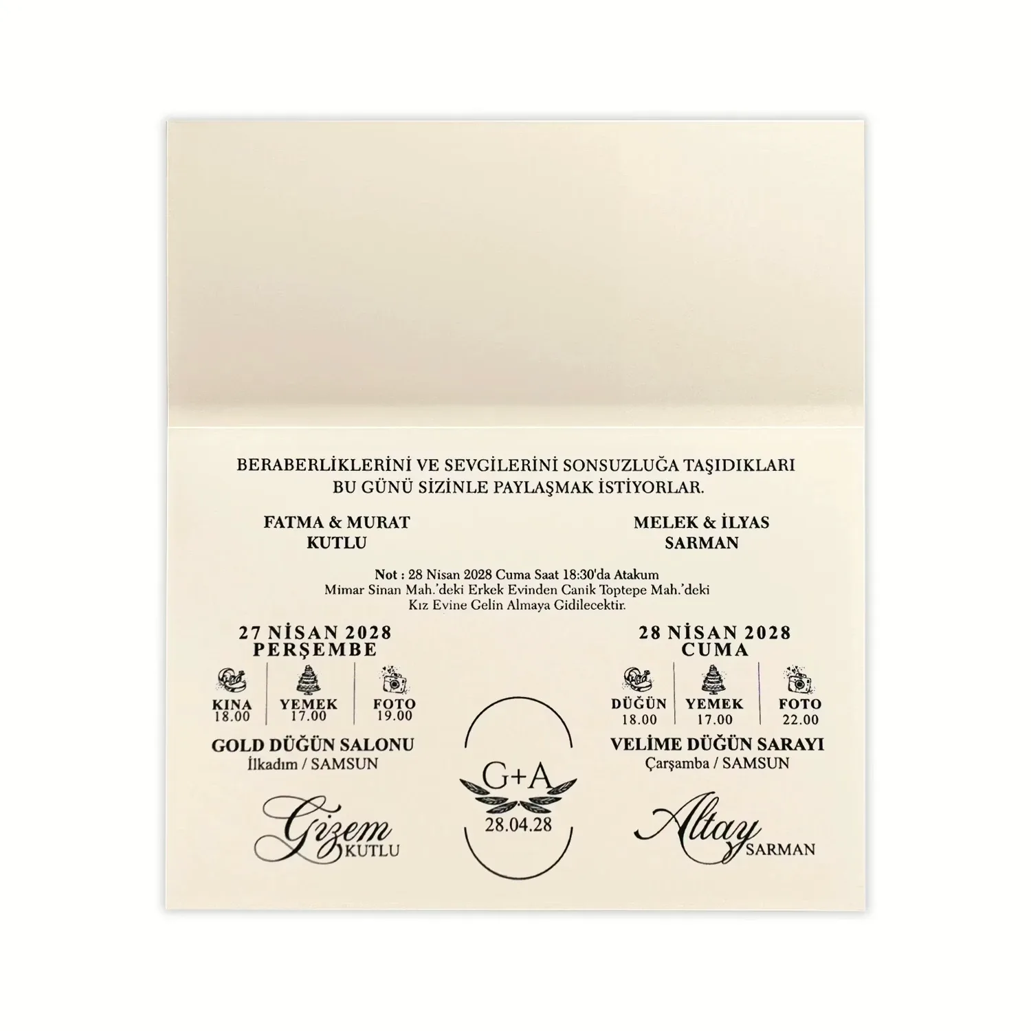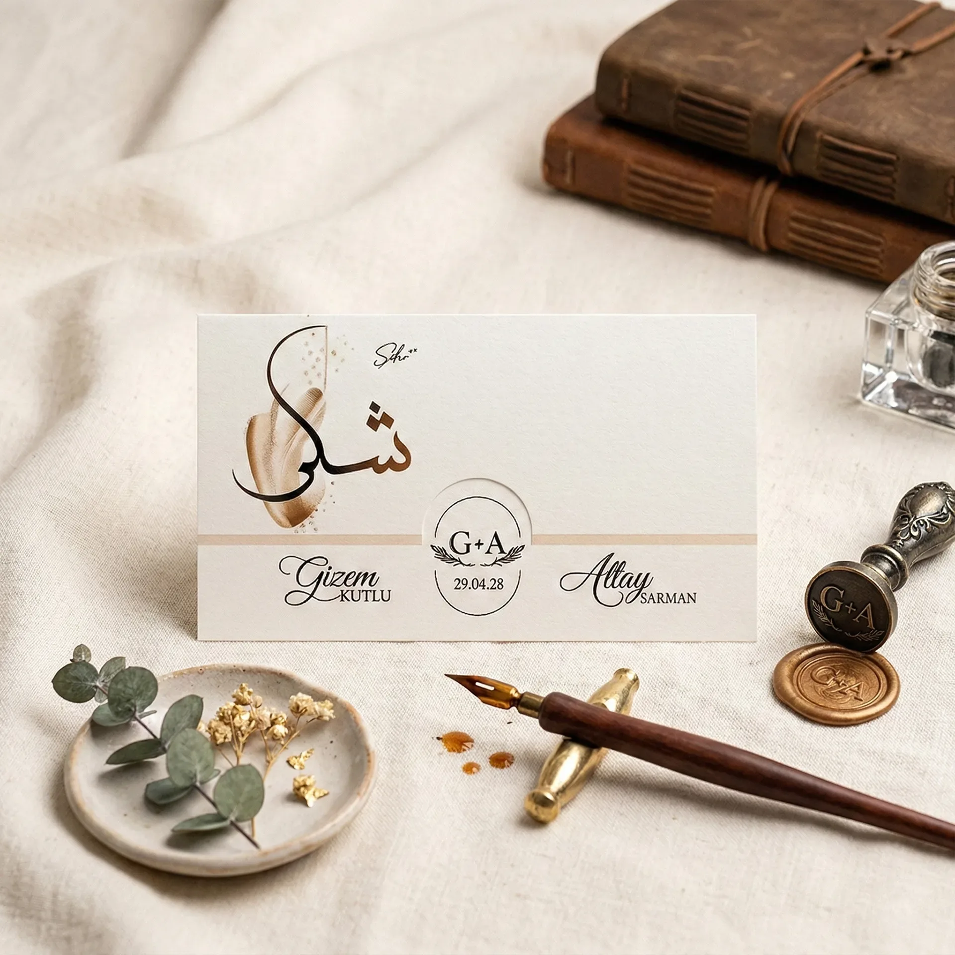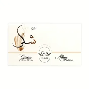 Söz, nikah, nişan ve düğün planlayan çiftler için özel olarak üretilmiş Dini Motifli Parlak Davetiye Davetiye 55 304 koduna sahiptir. Beyaz zemin üzerine krem renk tonlarında, sade ve şık tasarıma sahip davetiyede 16,7 cm x 10,4 cm 190gr. Amerikan Bristol kağıt kullanılmıştır. Ürün elinize açık şekilde ulaşacaktır. Kırım ve katlama izleri bellidir. Ürün elinize ulaştıktan sonra tarafınızdan yapılması gereken, kutuyu kırım ve katlama izlerinden katlayıp kelepçeleri yerine yerleştirmek olacaktır.