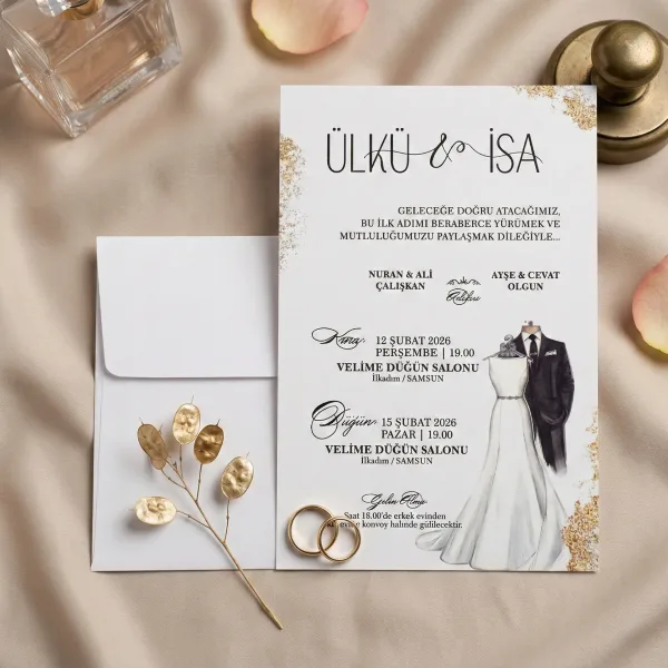 Söz, nikah, nişan ve düğün planlayan çiftler için özel olarak üretilmişGelinlik & Damatlık Desenli Davetiye 55 755 koduna sahiptir. Beyaz zemin ve gelinlik & damatlık detayları ile sade ve şık tasarıma sahip davetiyede 12 cm x 18 cm 190gr 1. Hamur kağıt kullanılmıştır. Ürün elinize açık şekilde ulaşacaktır. Kırım ve katlama izleri bellidir. Ürün elinize ulaştıktan sonra tarafınızdan yapılması gereken, kutuyu kırım ve katlama izlerinden katlayıp kelepçeleri yerine yerleştirmek olacaktır.