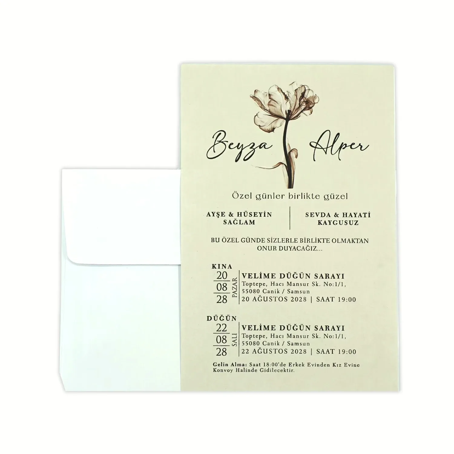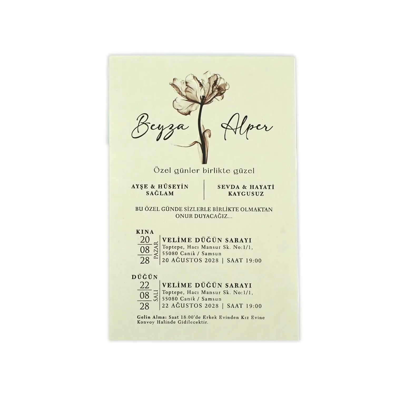 Söz, nikah, nişan ve düğün planlayan çiftler için özel olarak üretilmiş Krem Renkli Zarif Davetiye 55 852 koduna sahiptir. Krem zemin ve zarif tasarım detayları ile sade ve şık tasarıma sahip davetiyede 12 cm x 18 cm 190gr 1. Hamur kağıt kullanılmıştır. Ürün elinize açık şekilde ulaşacaktır. Kırım ve katlama izleri bellidir. Ürün elinize ulaştıktan sonra tarafınızdan yapılması gereken, kutuyu kırım ve katlama izlerinden katlayıp kelepçeleri yerine yerleştirmek olacaktır.