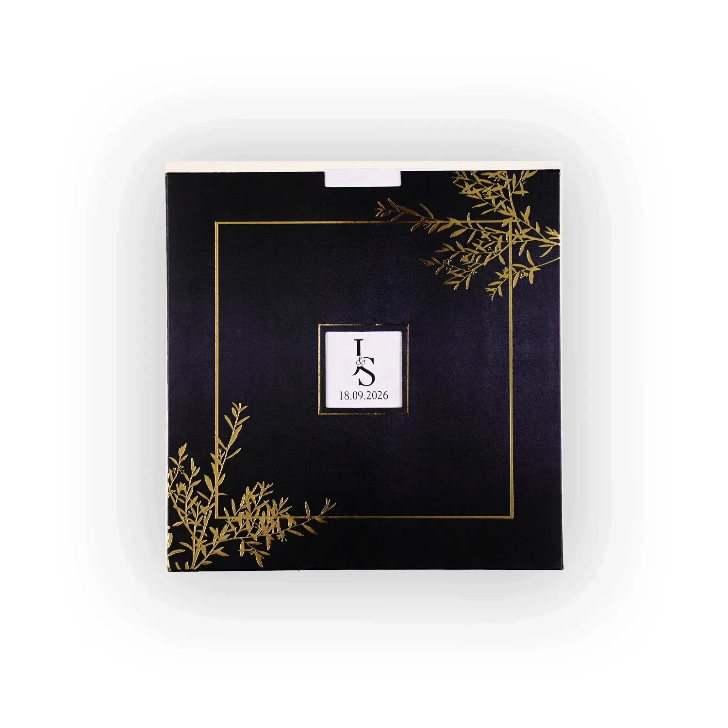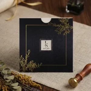 Söz, nikah, nişan ve düğün planlayan çiftler için özel olarak üretilmiş Lacivert Zeminli Altın Detaylı Davetiye 55 013 koduna sahiptir. Lacivert zemin ve yaldızlı desenler ile sade ve şık tasarıma sahip davetiyede 15 cm x 15,2 cm 190gr. Amerikan Bristol kağıt kullanılmıştır. Ürün elinize açık şekilde ulaşacaktır. Kırım ve katlama izleri bellidir. Ürün elinize ulaştıktan sonra tarafınızdan yapılması gereken, kutuyu kırım ve katlama izlerinden katlayıp kelepçeleri yerine yerleştirmek olacaktır.