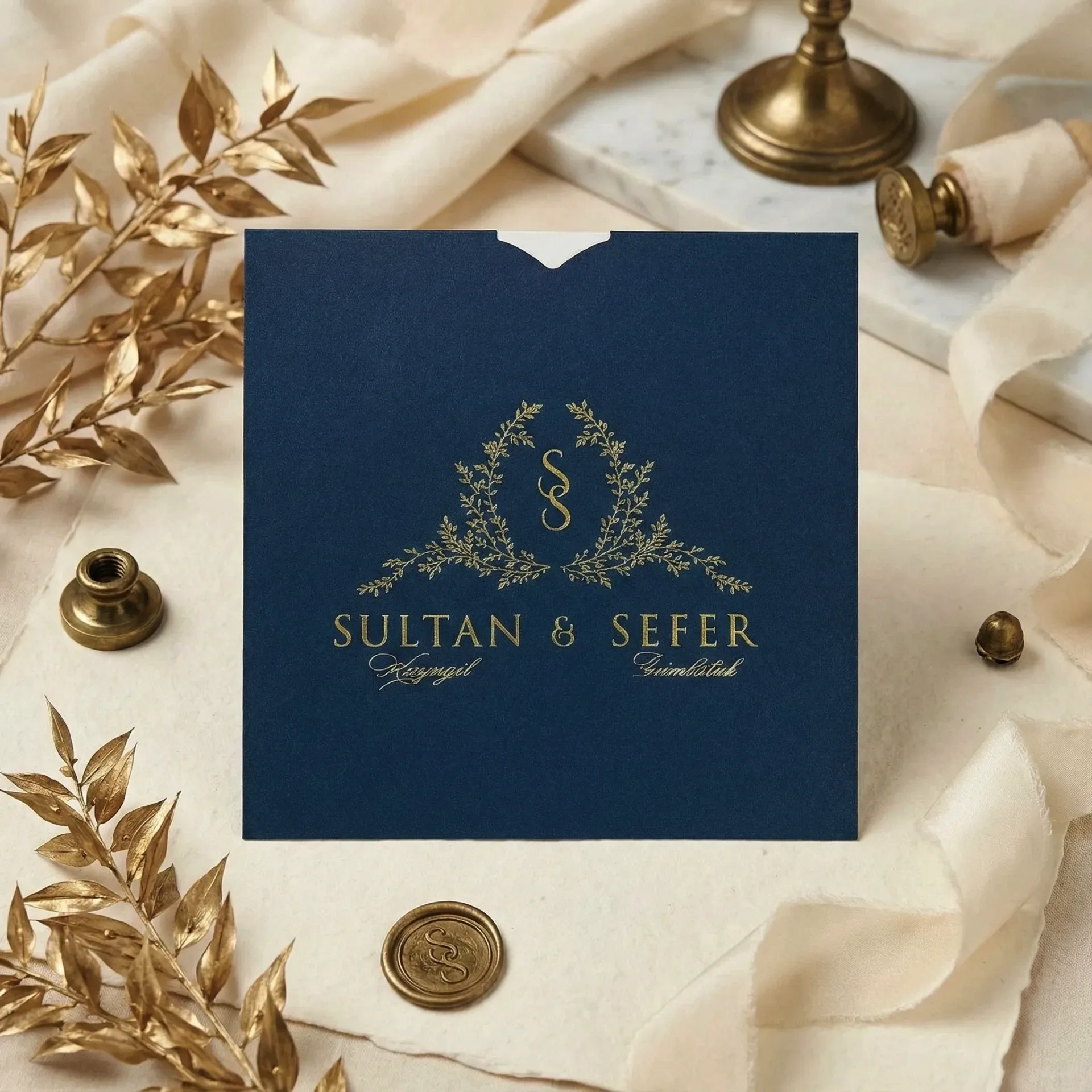 Söz, nikah, nişan ve düğün planlayan çiftler için özel olarak üretilmiş Lacivert Zeminli Altın Yaldızlı Kare Davetiye 55 203 koduna sahiptir. Lacivert zemin ve yaldız detayları ile sade ve şık tasarıma sahip davetiyede 15 cm x 15 cm 160gr. 1. Hamur kağıt kullanılmıştır. Ürün elinize açık şekilde ulaşacaktır. Kırım ve katlama izleri bellidir. Ürün elinize ulaştıktan sonra tarafınızdan yapılması gereken, kutuyu kırım ve katlama izlerinden katlayıp kelepçeleri yerine yerleştirmek olacaktır.