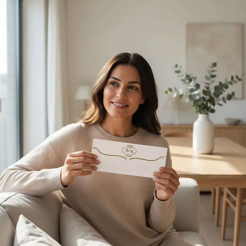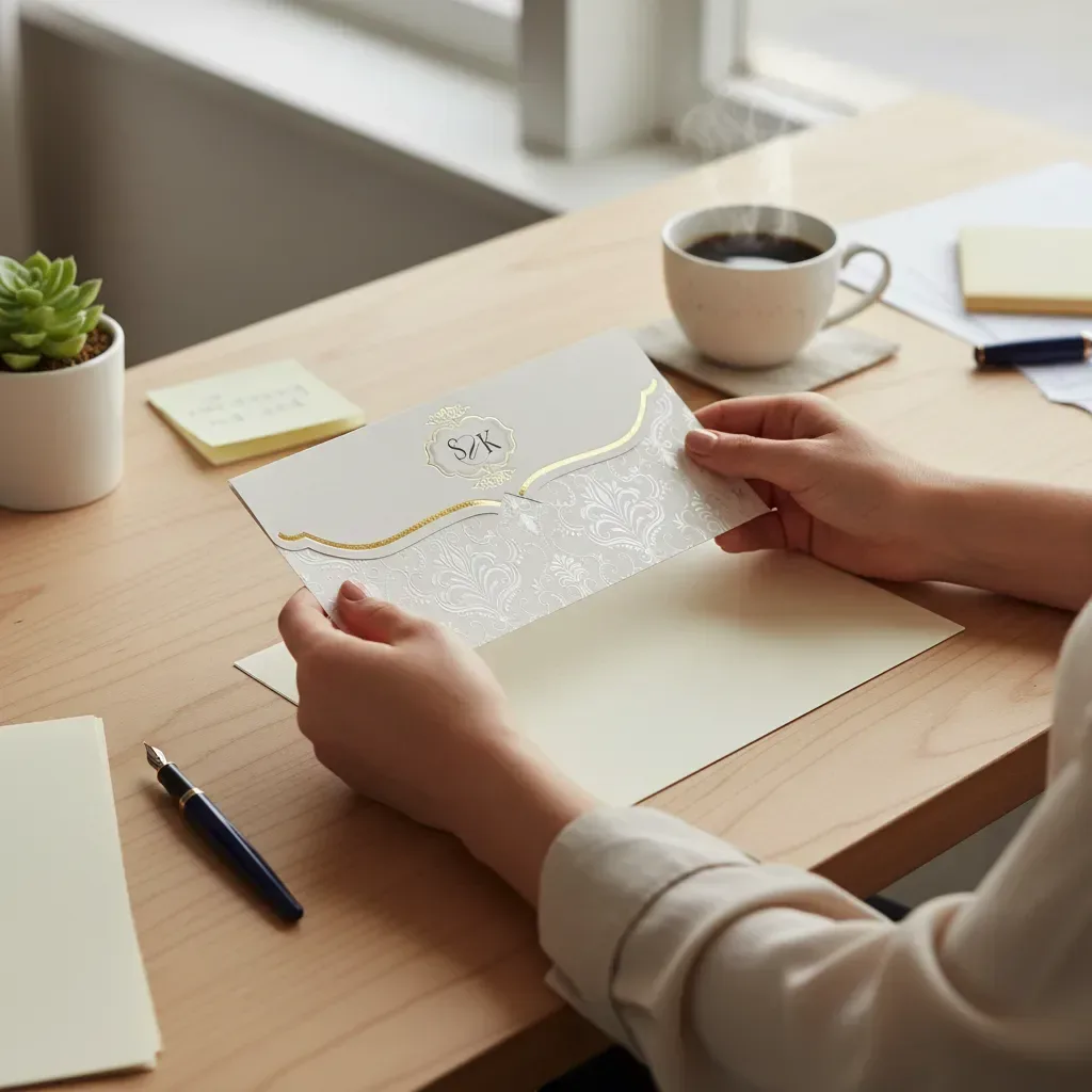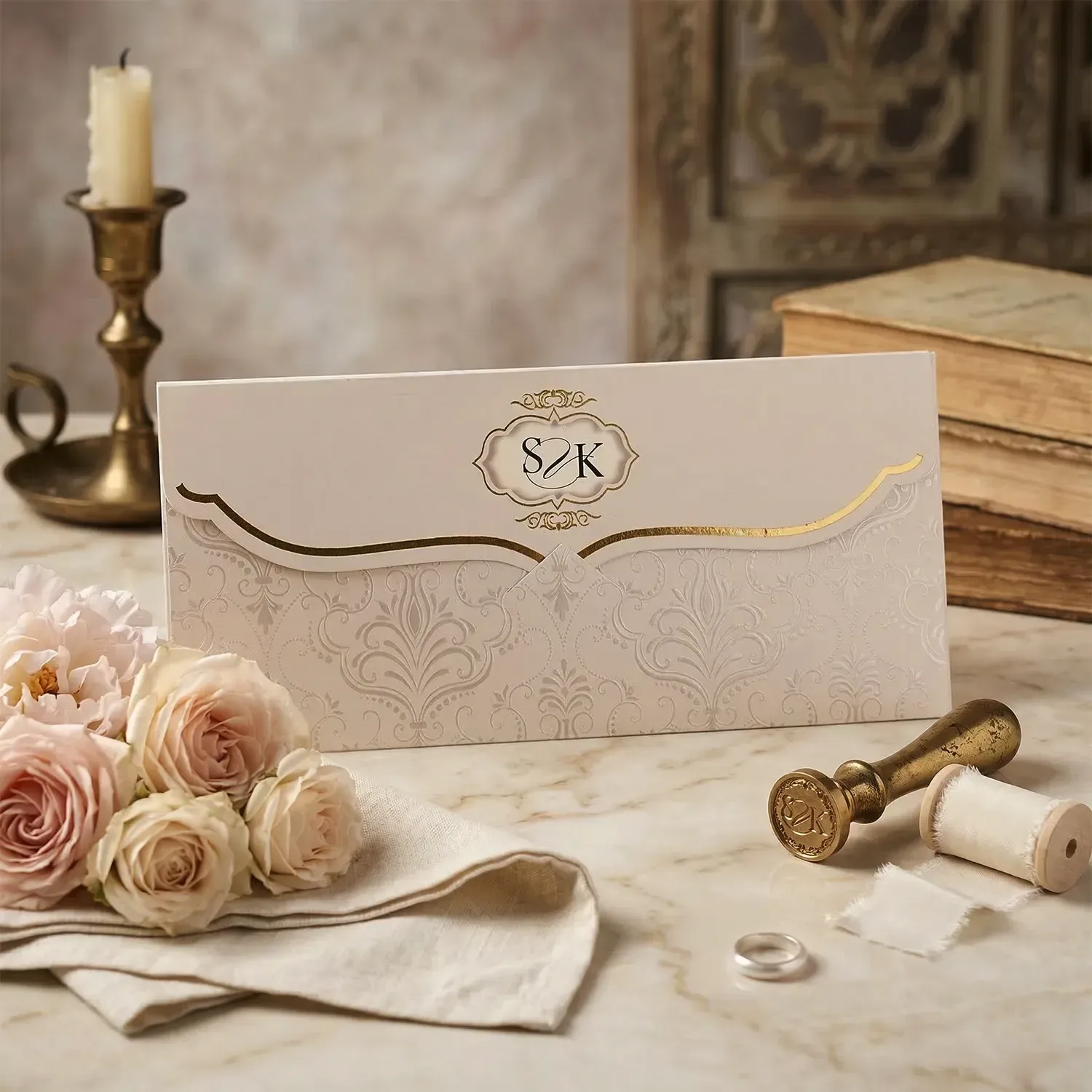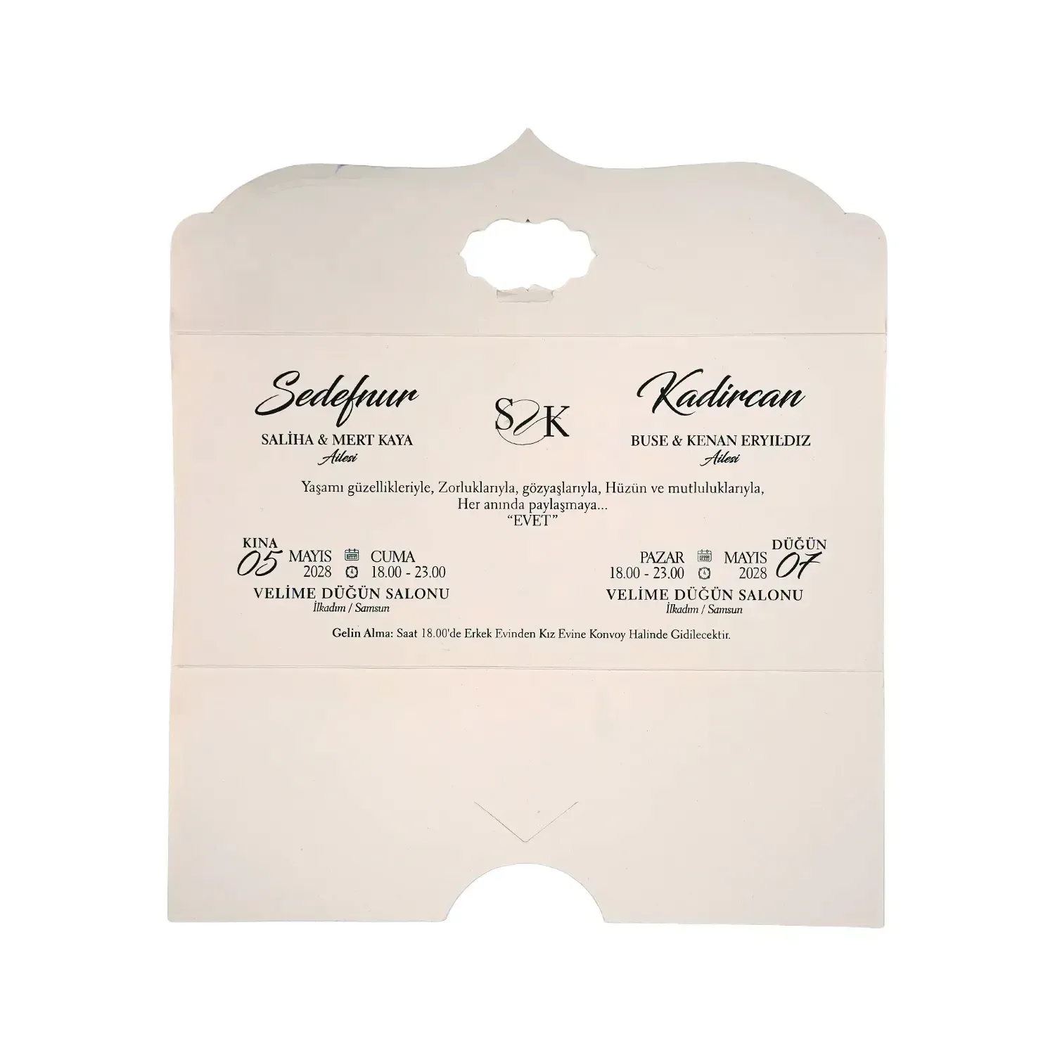 Kendinden zarflı olan sade ve şık tasarımlı davetiye 55 811 koduna sahiptir. Açık gri tonlarında, sade ve şık tasarıma sahip davetiyede 190gr. Amerikan Bristol kağıt kullanılmıştır. Katlandığında 21,1 cm x 9,9 cm ölçülerine sahip olan ürün elinize davetiye ve zarf olarak iki parça halinde ulaşmaktadır.