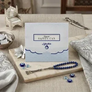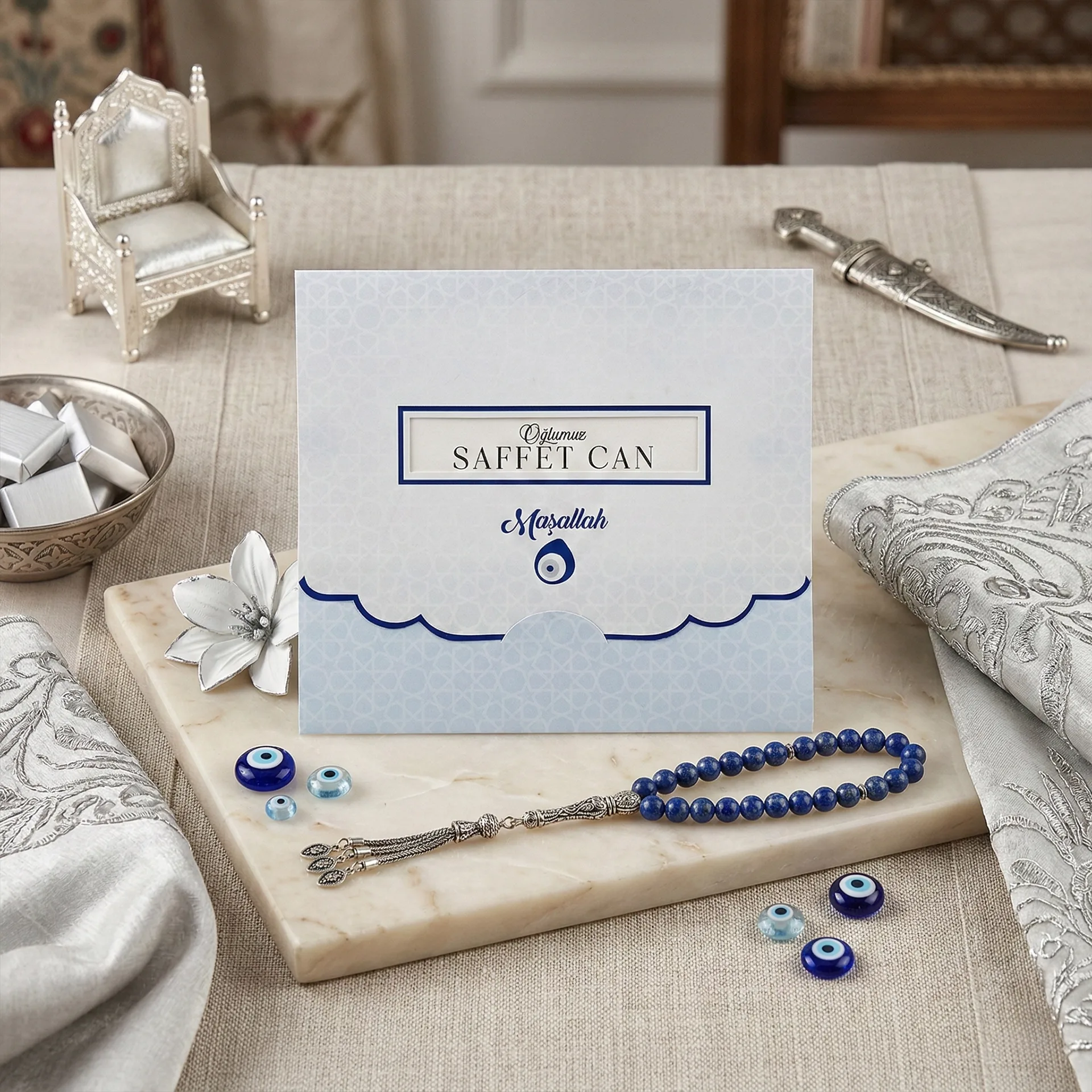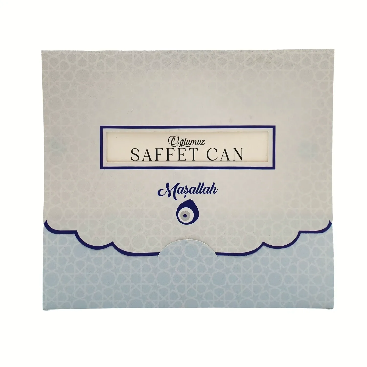 Sünnet olacak çocuklar için özel olarak üretilmiş Nazar Boncuğu Desenli davetiye 55 905 koduna sahiptir. Mavi renk tonlarında, sade ve şık tasarıma sahip davetiyede 16 cm x 14,3 cm 190gr. Amerikan Bristol kağıt kullanılmıştır. Ürün elinize açık şekilde ulaşacaktır. Kırım ve katlama izleri bellidir. Ürün elinize ulaştıktan sonra tarafınızdan yapılması gereken, kutuyu kırım ve katlama izlerinden katlayıp kelepçeleri yerine yerleştirmek olacaktır.