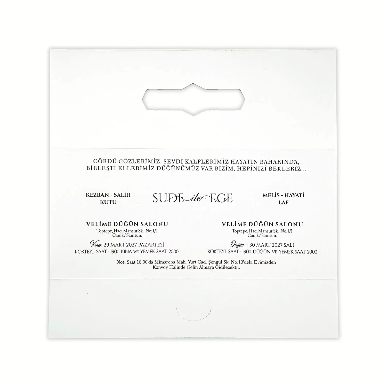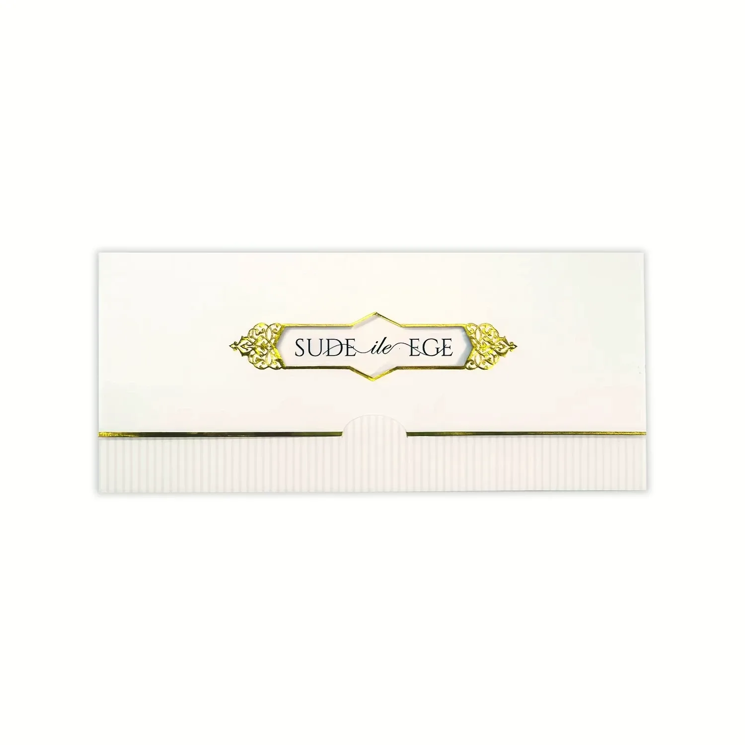 Söz, nikah, nişan ve düğün planlayan çiftler için özel olarak üretilmiş Osmanlı Desenli Yaldızlı Davetiye 55 813 koduna sahiptir. Krem zemin ve Osmanlı desenli detaylar ile sade ve şık tasarıma sahip davetiyede 22,6 cm x 10,3 cm 190gr 1. Hamur kağıt kullanılmıştır. Ürün elinize açık şekilde ulaşacaktır. Kırım ve katlama izleri bellidir. Ürün elinize ulaştıktan sonra tarafınızdan yapılması gereken, kutuyu kırım ve katlama izlerinden katlayıp kelepçeleri yerine yerleştirmek olacaktır.