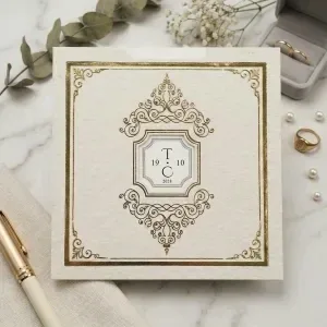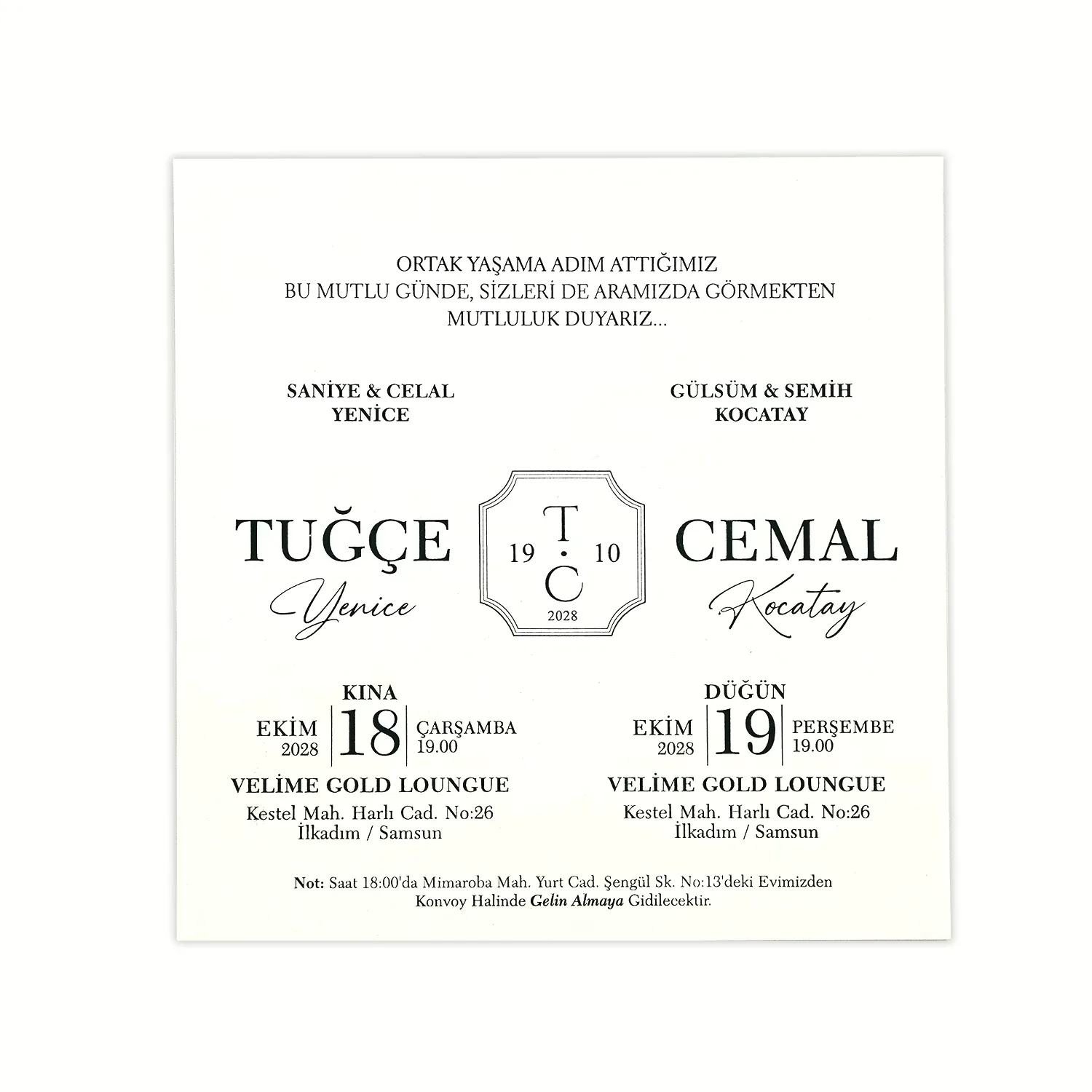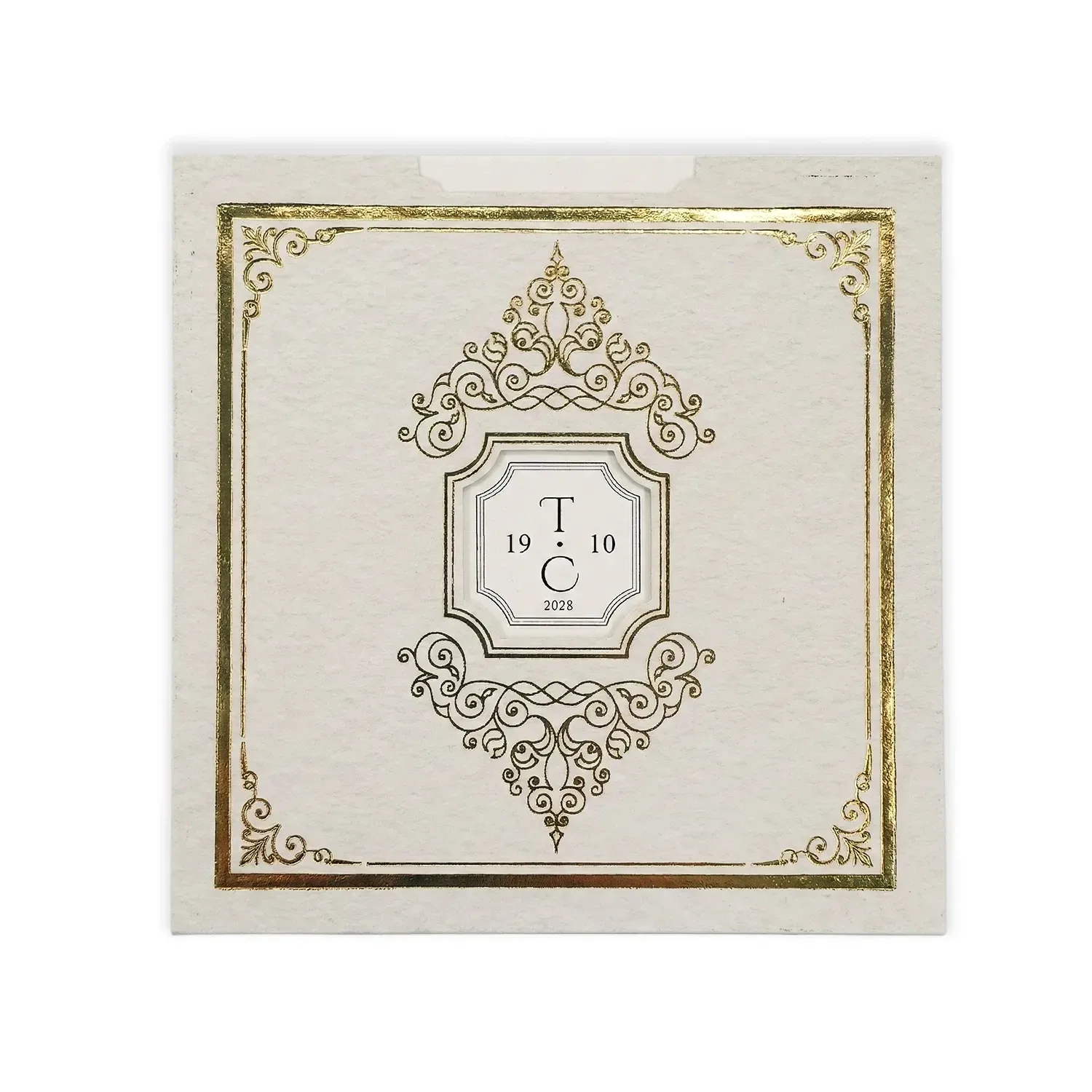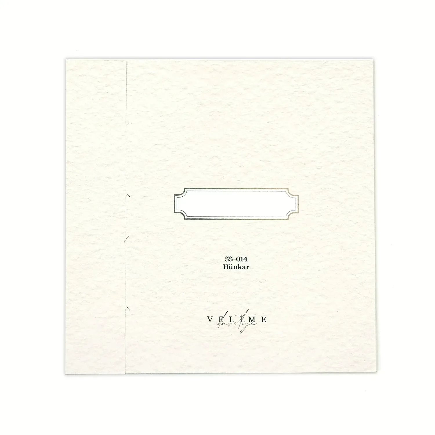 Söz, nikah, nişan ve düğün planlayan çiftler için özel olarak üretilmiş Osmanlı Esintili Altın Desenli Davetiye 55 014 koduna sahiptir. Beyaz zemin ve Osmanlı esintili yaldızlı desenleri ile sade ve şık tasarıma sahip davetiyede 15 cm x 15,2 cm 190gr. 1. Hamur kağıt kullanılmıştır. Ürün elinize açık şekilde ulaşacaktır. Kırım ve katlama izleri bellidir. Ürün elinize ulaştıktan sonra tarafınızdan yapılması gereken, kutuyu kırım ve katlama izlerinden katlayıp kelepçeleri yerine yerleştirmek olacaktır.