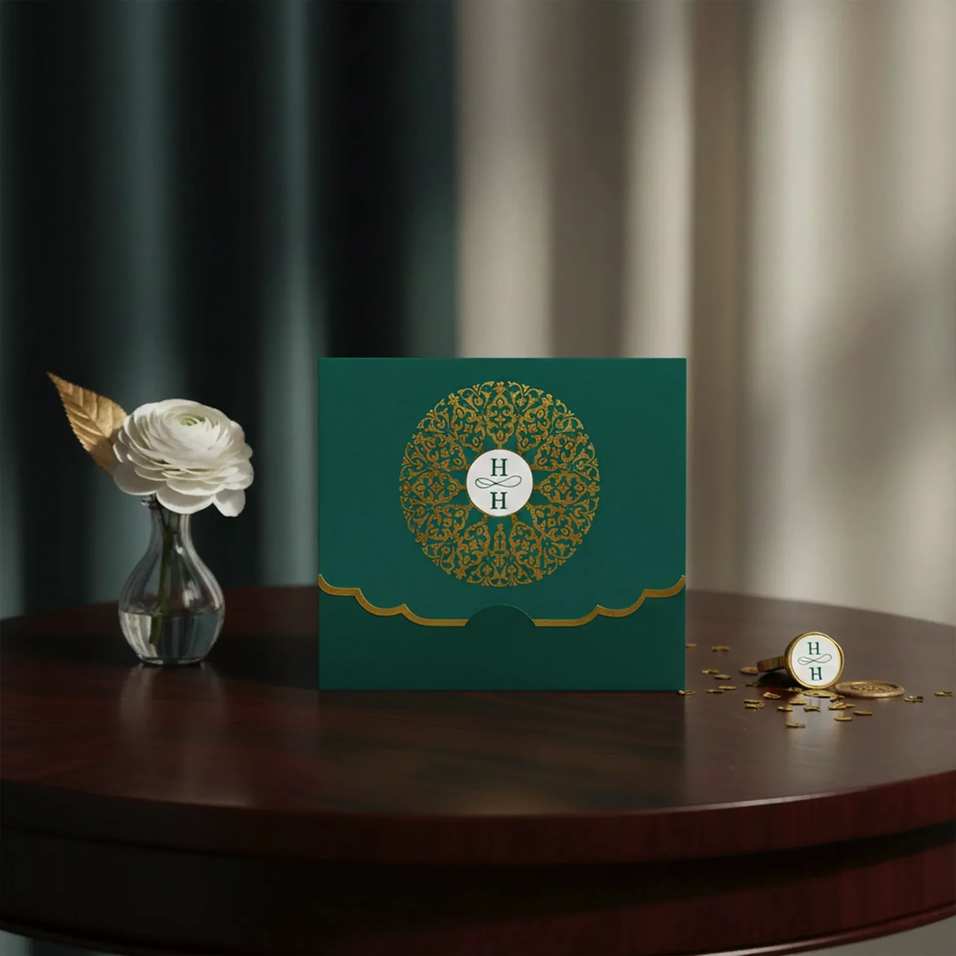 Söz, nikah, nişan ve düğün planlayan çiftler için özel olarak üretilmiş Otantik Motifli Yaldızlı Davetiye 55 214 koduna sahiptir. Yeşil zemin ve otantik motifler ile sade ve şık tasarıma sahip davetiyede 15,8 cm x 14,2 cm 190gr. 1. Hamur kağıt kullanılmıştır. Ürün elinize açık şekilde ulaşacaktır. Kırım ve katlama izleri bellidir. Ürün elinize ulaştıktan sonra tarafınızdan yapılması gereken, kutuyu kırım ve katlama izlerinden katlayıp kelepçeleri yerine yerleştirmek olacaktır.