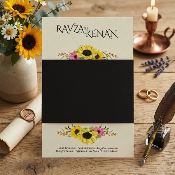 Söz, nikah, nişan ve düğün planlayan çiftler için özel olarak üretilmiş Romantik Ayçiçeği Desenli Davetiye 55 602 koduna sahiptir. Krem zemin üzerine fındıki renk tonlarında, sade ve şık tasarıma sahip davetiyede 16,7 cm x 10,4 cm 190gr. 1. Hamur kağıt kullanılmıştır. Ürün elinize açık şekilde ulaşacaktır. Kırım ve katlama izleri bellidir. Ürün elinize ulaştıktan sonra tarafınızdan yapılması gereken, kutuyu kırım ve katlama izlerinden katlayıp kelepçeleri yerine yerleştirmek olacaktır.