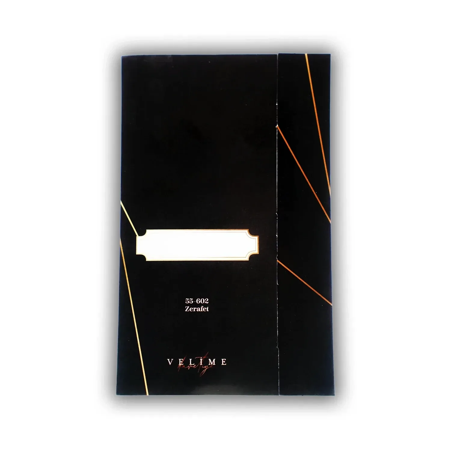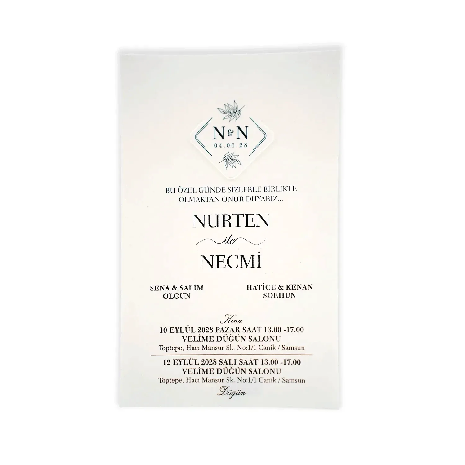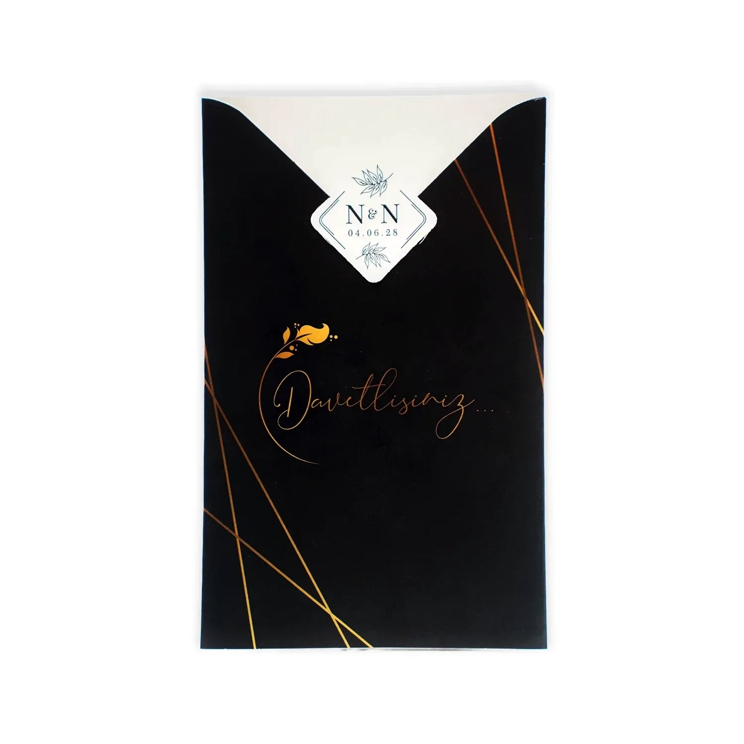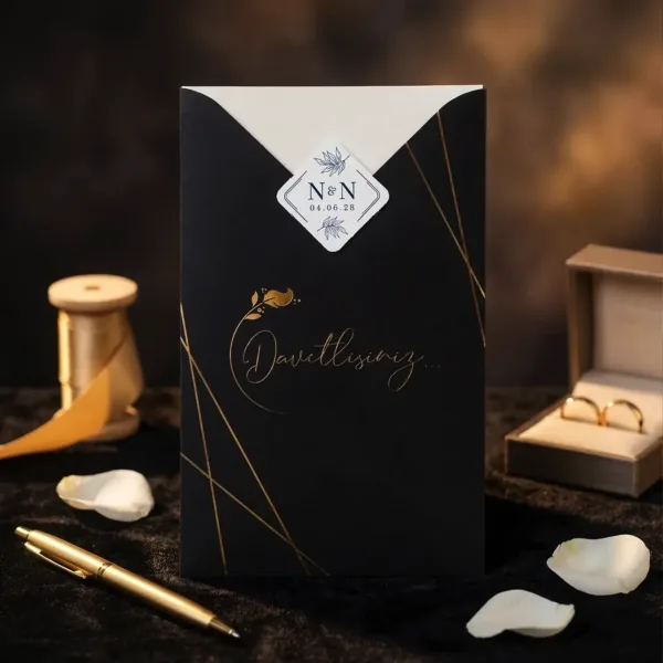 Kendinden zarflı olan sade ve şık tasarımlı davetiye 55 306 koduna sahiptir. Siyah renk tonlarında, sade ve şık tasarıma sahip davetiyede 10,2 cm x 16,4 cm 190gr. Amerikan Bristol kağıt kullanılmıştır. Ürün elinize kutu ve iç baskı kartonu şeklinde iki parça olarak ulaşacaktır. Kutu kelepçelidir. Kırım ve katlama izleri bellidir. Ürün elinize ulaştıktan sonra tarafınızdan yapılması gereken, kutuyu kırım ve katlama izlerinden katlayıp kelepçeleri yerine yerleştirmek olacaktır.