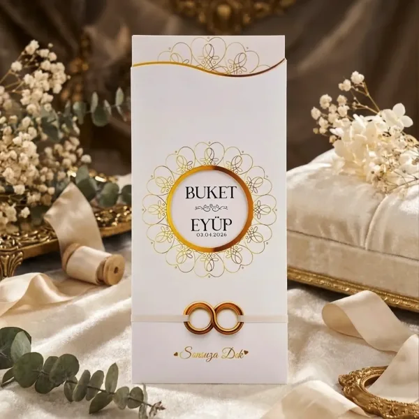 Kendinden zarflı olan sade ve şık tasarımlı davetiye 55 103 koduna sahiptir. Beyaz renk tonlarında Sonsuza Dek işlemeli, sade ve şık tasarıma sahip davetiyede 10,2 cm x 23 cm 190gr. Amerikan Bristol kağıt kullanılmıştır. Ürün elinize kutu ve iç baskı kartonu şeklinde iki parça olarak ulaşacaktır. Kutu kelepçelidir. Kırım ve katlama izleri bellidir. Ürün elinize ulaştıktan sonra tarafınızdan yapılması gereken, kutuyu kırım ve katlama izlerinden katlayıp kelepçeleri yerine yerleştirmek olacaktır.