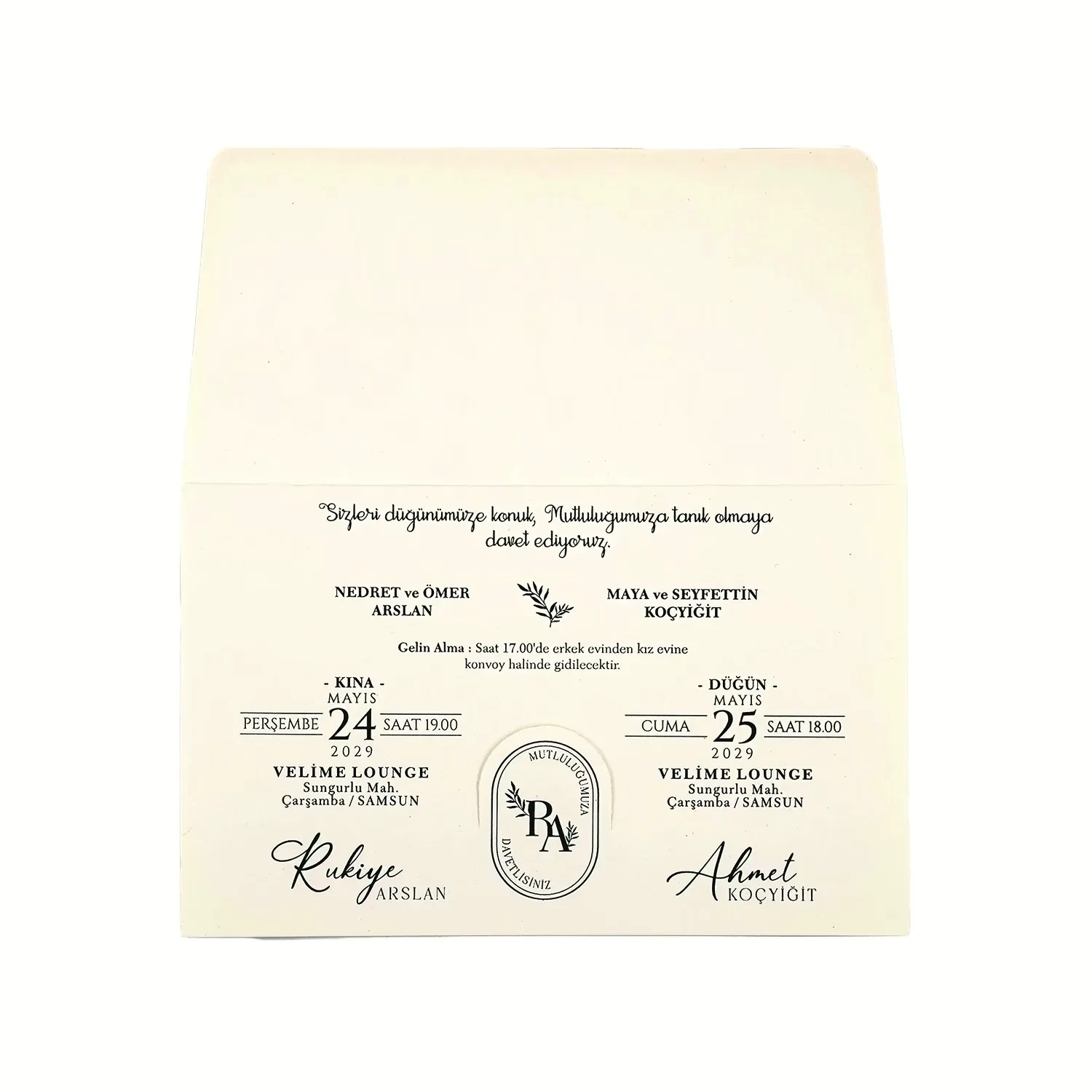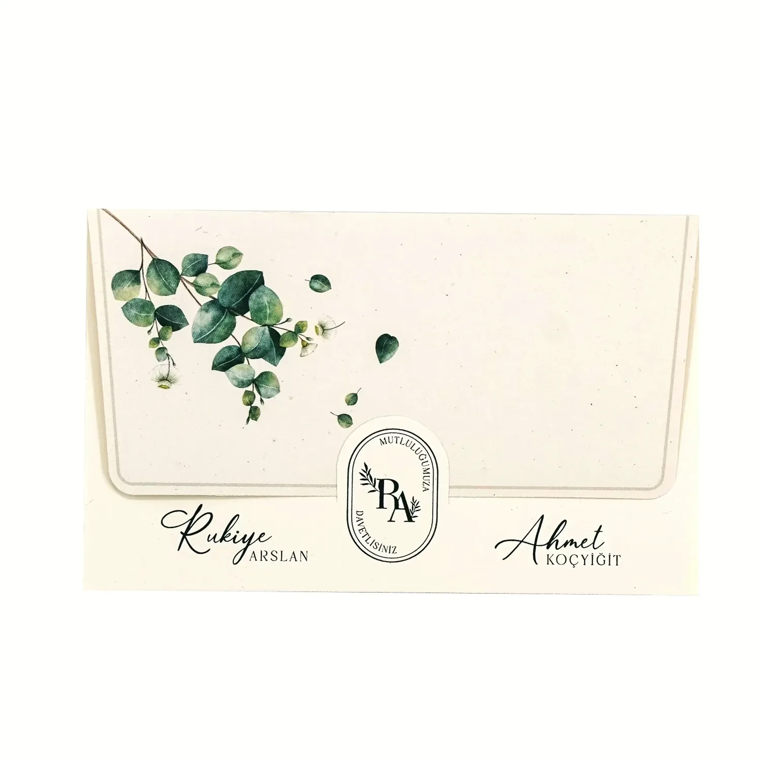 Söz, nikah, nişan ve düğün planlayan çiftler için özel olarak üretilmiş Yeşil Yapraklı Modern Yatay Davetiye 55 212 koduna sahiptir. Gri zemin ve yeşil yapraklı detaylar ile sade ve şık tasarıma sahip davetiyede 16,7 cm x 10,4 cm 190gr Amerikan Bristol kağıt kullanılmıştır. Ürün elinize açık şekilde ulaşacaktır. Kırım ve katlama izleri bellidir. Ürün elinize ulaştıktan sonra tarafınızdan yapılması gereken, kutuyu kırım ve katlama izlerinden katlayıp kelepçeleri yerine yerleştirmek olacaktır.