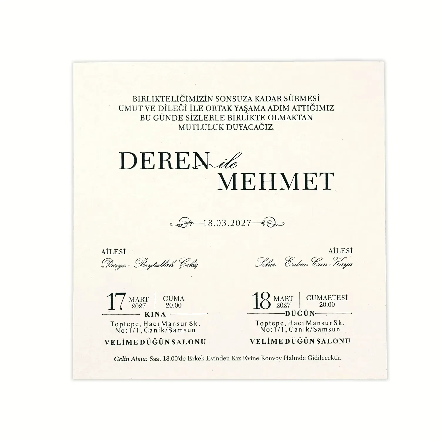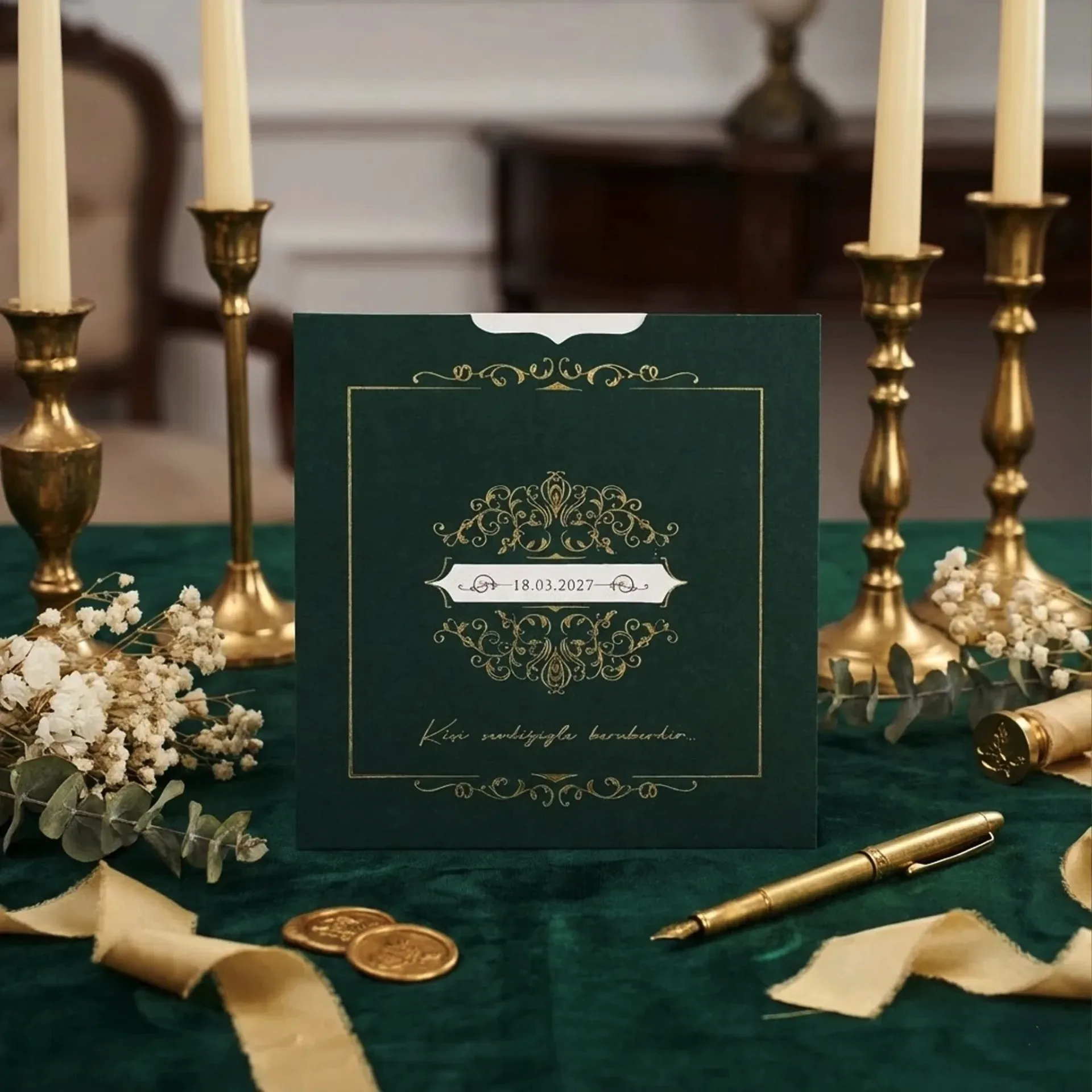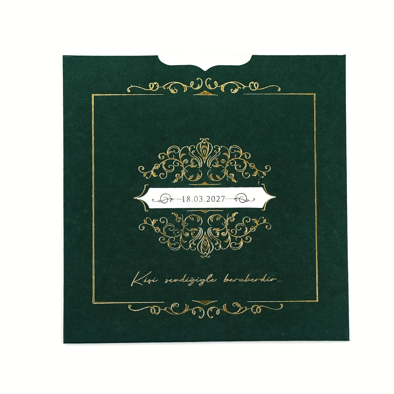 Söz, nikah, nişan ve düğün planlayan çiftler için özel olarak üretilmiş Zümrüt Yeşili Altın Varaklı Lüks Davetiye 55 003 koduna sahiptir. Zümrüt yeşili zemin ve yaldızlı desenler ile sade ve şık tasarıma sahip davetiyede 15 cm x 15,2 cm 190gr. 1. Hamur kağıt kullanılmıştır. Ürün elinize açık şekilde ulaşacaktır. Kırım ve katlama izleri bellidir. Ürün elinize ulaştıktan sonra tarafınızdan yapılması gereken, kutuyu kırım ve katlama izlerinden katlayıp kelepçeleri yerine yerleştirmek olacaktır.